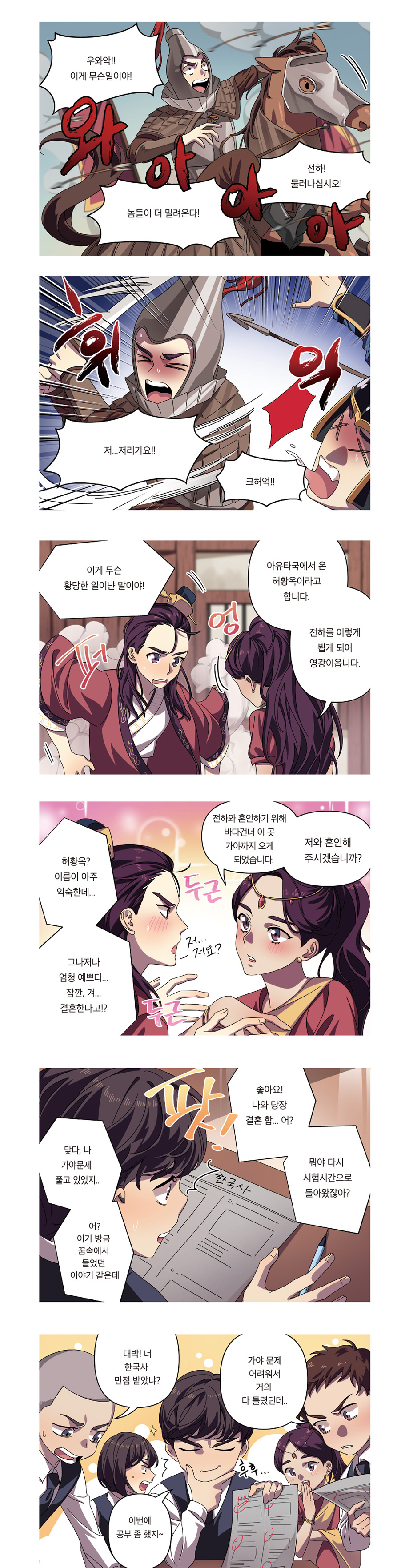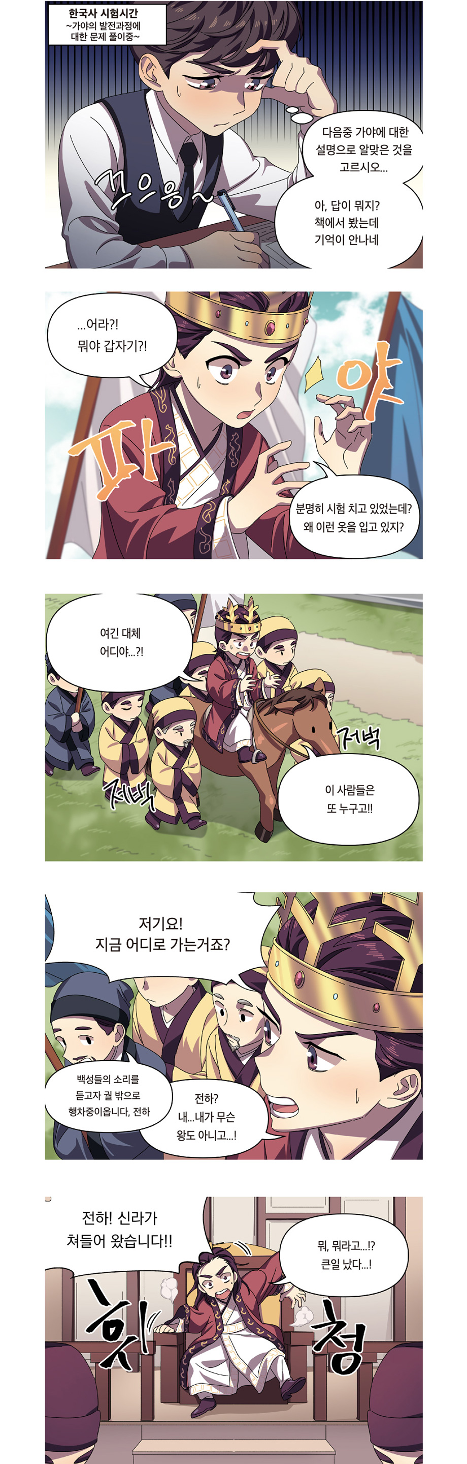 본 만화는 가야의 역사를 모티브로 한 창작 만화로, 주인공인 김수로는 현재 시대를 살아가는 학생으로 학교에서 가야 역사에 관한 시험을 치던 중 알 수 없는 현상으로 과거 가야시대로 타임슬립을 하게 됩니다. 그 곳에서 짧은 시간 그 당시의 여러 역사적인 사실들을 직접 체험하게 되고 허황옥도 만나게 됩니다. 허황옥과의 사랑이 이루어지려던 결정적인 순간 현재로 되돌아오게 된 김수로는 아쉬운 마음으로 시험을 치르게 되지만 타임슬립 당시 이미 겪었던 가야시대의 사건들을 시험에 잘 풀어내어 시험에서 100점을 받게 된다는 이야기입니다.