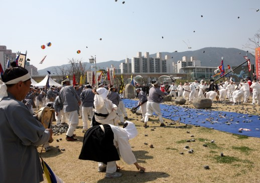 동국여지승람의 기록에 보면 김해지방에서는 매년 음력 4월 초파일 경부터 마을 사람들이 무리를 지어 성(城)의 남쪽지역에서 온 마을 사람들이 좌, 우부(左, 右部)로 나누어 편을 가르고 깃발을 세우고 북을 치며 기상을 돋우고 돌을 던져 상대편을 공격하는데 마치 돌비(石雨)가 오는 것 같았다고 한다. 사상자가 생겨도 승부가 가려질 때까지 싸웠다고 하며 음력 5월 단옷 날에 그 절정을 이루었다고 한다.