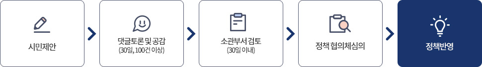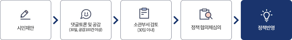 시민 제안 → 댓글토론 및 공감(30일, 공감100건 이상) → 소관부서 검토(30일 이내) → 정책 협의체 심의 → 정책 반영이미지 크게 보기