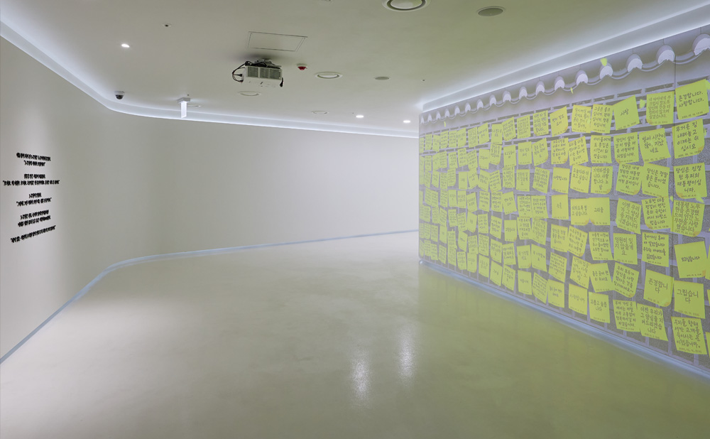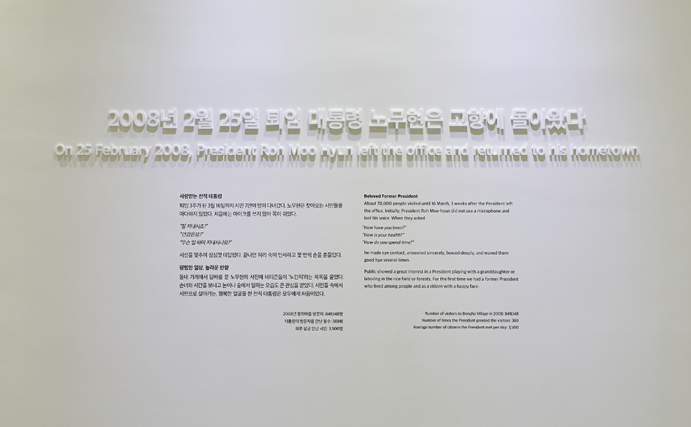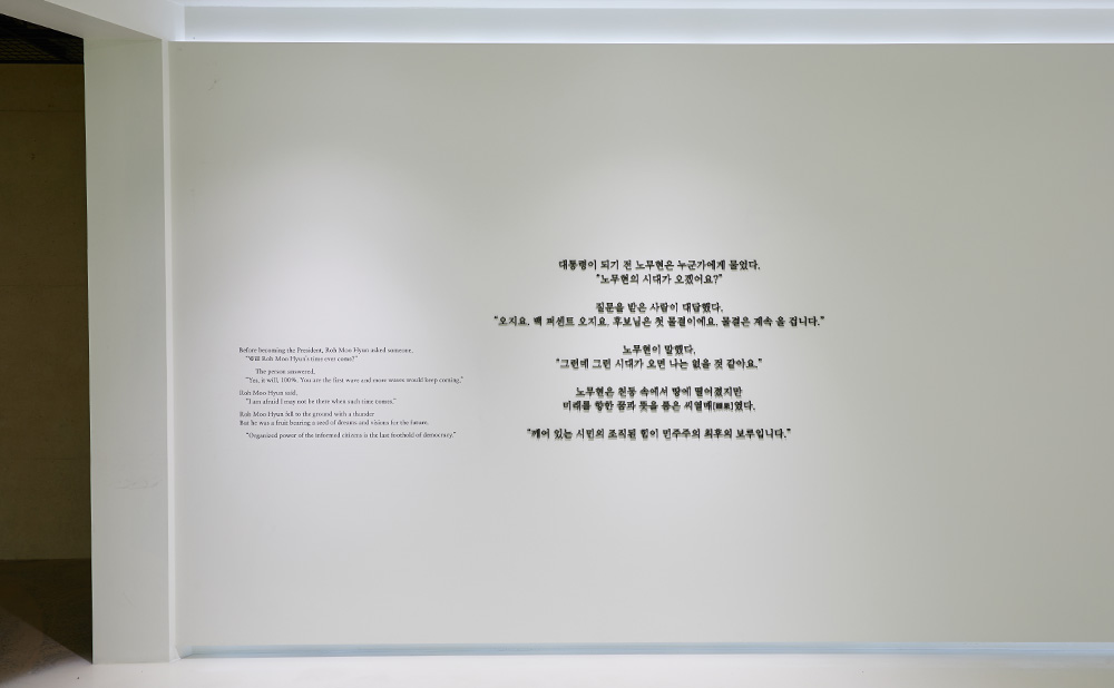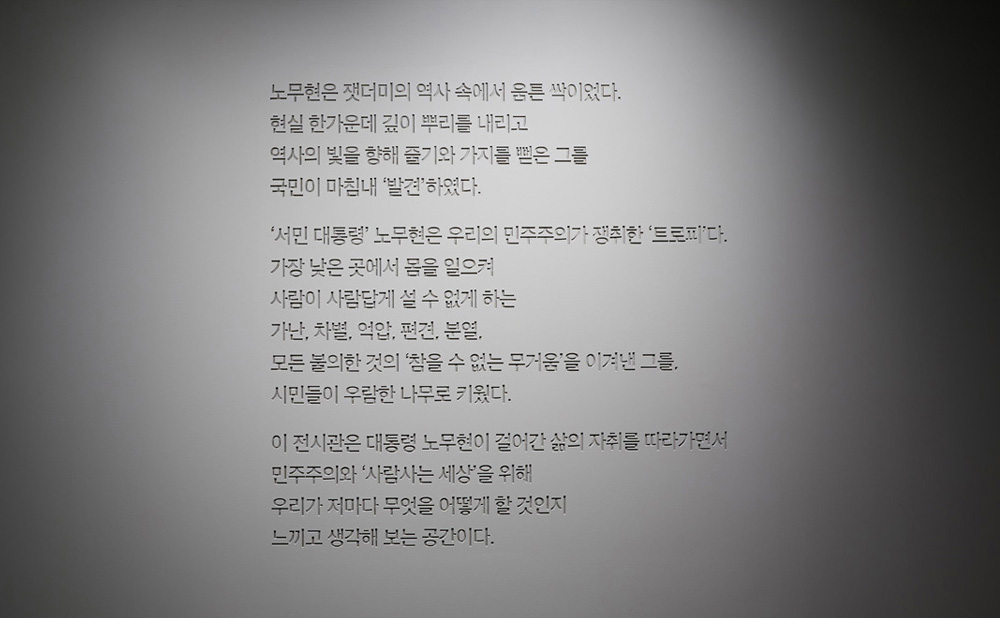 노무현 대통령의 마지막 길을 좇아가며 전시의 관람을 마무리하는 공간입니다. 민주주의와 사람사는 세상을 위한 우리의 역할과 자세를 생각하고 정리해볼 수 있습니다.