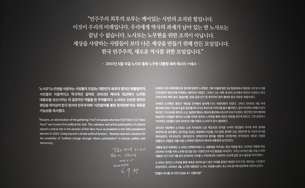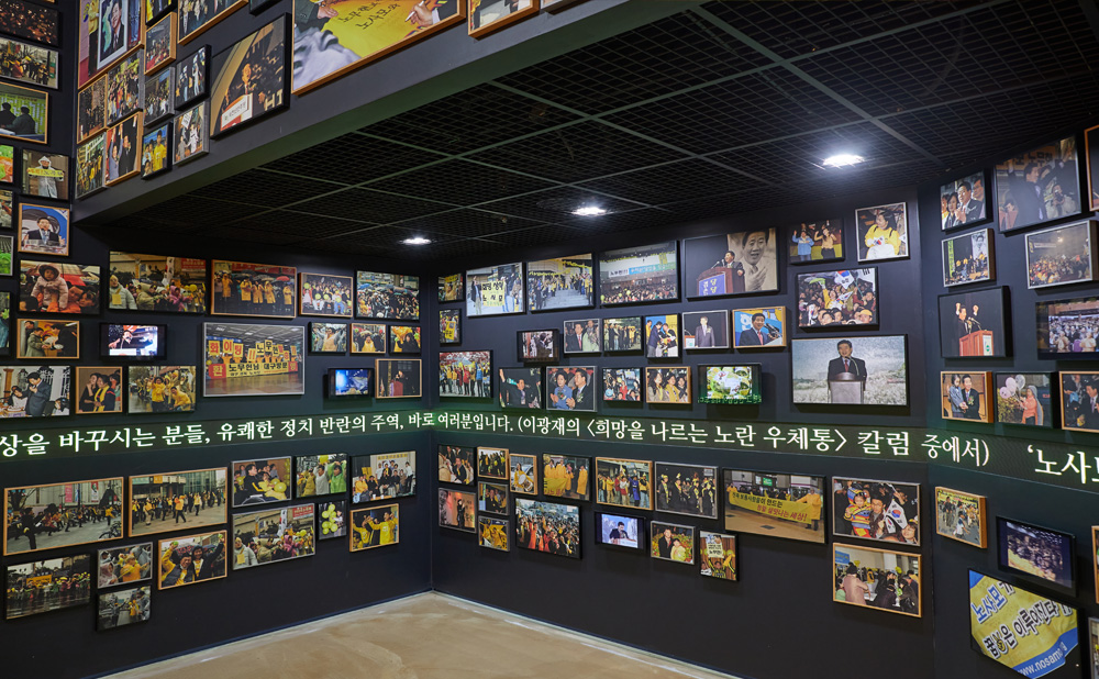 2002년 대통령 노무현을 만들어낸 주인공 ‘노사모’를 만나볼 수 있는 전시실입니다. 활동 사진과 영상, 응원 글을 통해 깨어있는 시민의 조직된 힘을 간접적으로 체험해볼 수 있습니다.
