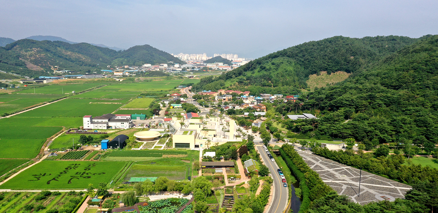 김해시 진영읍 본산리를 이루는 다섯 마을 중 하나로 봉화산 봉수대 아래 있다 하여 봉하(烽下)마을이라 불립니다. 마을을 감싸고 있는 봉화산은 해발 141m의 비교적 낮은 산이지만, 정상에 오르면 낙동강과 드넓은 유역평야 그 뒤로 이어진 산봉우리(連峯)를 한눈에 담을 수 있습니다. 이러한 이유로 노무현 대통령은 봉화산을 낮으면서 높은 산으로 소개하기도 했습니다.