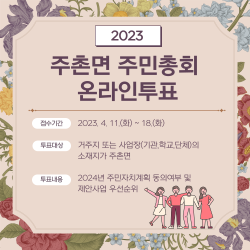 2023년 주촌면 주민총회 온라인 투표 ○ 투표기간 : 2023. 4. 11.(화) ~ 4. 18.(화) ○ 투표대상 : 거주지 또는 사업장(기관,단체,학교)의 소재지가 주촌면인 사람 ○ 투표내용 : 2024년 주촌면 주민자치회 자치계획안 동의여부 및 제안사업 우선순위