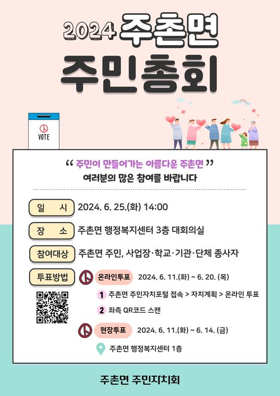 2024년 주촌면 주민총회 온라인 투표 ○ 투표기간 : 2024. 6. 11.(화) ~ 6. 20.(목) ○ 투표대상 : 주촌면 주민등록자, 관내 사업장 종사자 또는 학교·기관·단체 속한 사람, 외국인등록대장 기록 되어 있는 사람 ○ 투표내용 : 2025년 주촌면 자치계획 및 주민자치회 제안사업, 2024년 주민자치회 제안사업 변경 동의 여부