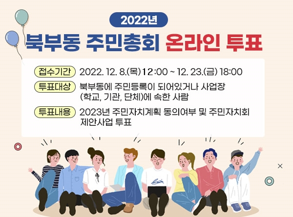 2022년 북부동 주민총회 온라인 투표 ○ 접수기간 : 2022. 12. 8.(목) 12:00 ~ 12. 23.(금) 18:00 ○ 투표대상 : 북부동에 주민등록이 되어있거나 사업장(학교, 기관, 단체)에 속한 사람 ○ 투표내용 : 2023년 주민자치계획 동의여부 및 주민자치회 제안사업 투표