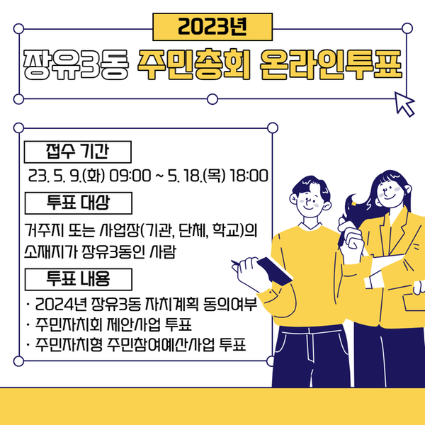 2023년 장유3동 주민총회 온라인 투표 ○ 투표기간 : 2023. 5. 9.(화) ~ 5. 18.(목) ○ 투표대상 : 거주지 또는 사업장(기관,단체,학교)의 소재지가 장유3동인 사람 ○ 투표내용 : 2024년 장유3동 주민자치회 자치계획안 동의여부 및 제안사업 우선순위