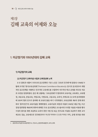 %uc81c1%uc7a5 %uae40%ud574 %uad50%uc721%uc758 %uc5b4%uc81c%uc640 %uc624%ub2981. %ubbf8%uad70%uc815%uae30%uc640 1950%ub144%ub300%uc758 %uae40%ud574 %uad50%uc7211) %ubbf8%uad70%uc815%uae30%uc758 %uad50%uc721(1) %ubbf8%uad70%uc815%uae30 %uad50%uc721%uc774%ub150 %uc218%ub9bd%uacfc %uad50%uc721%uc815%uc0c1%ud654 %ub178%ub8258%u00b715 %uad11%ubcf5%uacfc %ub354%ubd88%uc5b4 %uc6b0%ub9ac%ub098%ub77c %ubb38%uad50%uc815%ucc45%uc758 %uae30%ubcf8 %ub178%uc120%uc740 %u2018%uad50%uc721%uc758 %ubbfc%uc8fc%ud654%u2019%uc5d0 %uc788%uc5c8%ub2e4.1 1948%ub144 9%uc6d4%uc5d0 %uc870%uc9c1%ub41c %u2018%ud55c%uad6d%uad50%uc721%uc2ec%uc758%ud68c%u2019(The Korean Committee on Education)%ub294 %ub2f9%uc2dc%uc758 %ubb38%uad50%ub2f9%uad6d%uc774 %uac1c%ubc29%uc801%uc778 %ubb38%uad50%uc815%ucc45%uc744 %uc9c0%ud5a5%ud558%uace0 %ubbfc%uc8fc%uc801%uc778 %uad50%uc721%uc81c%ub3c4%ub97c %uc218%ub9bd%ud558%uba70 %uc790%uc8fc%uc801%uc778 %ud559%uad50 %uc6b4%uc601%uc744 %ud558%ub3c4%ub85d %uc790%ubb38%uacfc %uc870%uc5b8%uc744 %ub2f4%ub2f9%ud558%uc600%ub2e4. %uac19%uc740 %ud574 11%uc6d4%uc5d0%ub294 %u2018%uad50%uc721%uc2ec%uc758%ud68c%u2019%uac00 %ubc1c%uc871%ud558%uc5ec %uad50%uc721%uc774%ub150, %uad50%uc721%uc81c%ub3c4, %uad50%uc721%ud589%uc815, %ucd08%ub4f1%uad50%uc721, %uc911%ub4f1%uad50%uc721, %uc9c1%uc5c5%uad50%uc721, %uc0ac%ubc94%uad50%uc721, %uace0%ub4f1%uad50%uc721, %uad50%uacfc%uc11c, %uc758%ud559%uad50%uc721 %ub4f1 10%uac1c %ubd84%uacfc%uc704%uc6d0%ud68c%uc5d0 100%uc5ec %uba85%uc758 %uc778%uc0ac%uac00 %ucc38%uc5ec%ud574 %uc0c8 %uad50%uc721%uc758 %ud2c0%uc744 %uc9dc%uae30 %uc2dc%uc791%ud558%uc600%ub2e4. %uad50%uc721%uc2ec%uc758%ud68c %uc81c4%ucc28 %uc804%uccb4 %ud68c%uc758%uc5d0%uc11c %u2018%ud64d%uc775%uc778%uac04%u2019%uc758 %uad50%uc721%uc774%ub150%uc744 %ucc44%ud0dd%ud558%uc600%ub2e4. %uad50%uc721%uc774%ub150%uc758 %uc81c%uc815%uacfc %uc544%uc6b8%ub7ec 1945%ub144 9%uc6d4 17%uc77c, %ubbf8%uad70%uc815%uccad %uc77c%ubc18%uba85%ub839 %uc81c4%ud638%uc5d0 %uc758%ud558%uc5ec %ucde8%ud574%uc9c4 %uc8fc%uc694 %ubb38%uad50%uc815%ucc45%uc740 %uad50%uc218%uc6a9%uc5b4%uc758 %uc6b0%ub9ac%ub9d0 %uc0ac%uc6a9%uc744 %ube44%ub86f%ud55c %ud669%uad6d %uc0ac%uc0c1%uc758 %ubd88%uc2dd%uc744 %uc704%ud55c %ucd08%ub4f1%ud559%uad50 %uad50%uacfc%uc11c %ud3b8%ucc2c %uc0ac%uc5c5 %ubc0f %ubcf4%uae09, %ubbfc%uc8fc%uad50%uc721 %uc774%ub150%uc744 %ubcf4%uae09%ud558%uae30 %uc704%ud55c %uad50%uc0ac %uc7ac%uad50%uc721 %uac15%uc2b5, %uad50%uc721%uc81c%ub3c4%uc758 %ubbfc%uc8fc%ud654(%uc885%ub798%uc758 %ubcf5%uc120%ud615 %ud559%uc81c%uc5d0%uc11c %ub2e8%uc120%ud615 %ud559%uc81c%ub85c %uac1c%ud601), %ubb38%ub9f9 %ud1f4%uce58%ub97c %uc704%ud55c 1%u3000 %uc911%uc559%ub300%ud559%uad50%ubd80%uc124%ud55c%uad6d%uad50%uc721%ubb38%uc81c%uc5f0%uad6c%uc18c, %u300e%ubb38%uad50%uc0ac%u300f, %uc911%uc559%ub300%ud559%uad50%ucd9c%ud310%uad6d, 1974, 25%ucabd.16%u2022 %uc81c1%uc7a5 %uae40%ud574 %uad50%uc721%uc758 %uc5b4%uc81c%uc640 %uc624%ub298