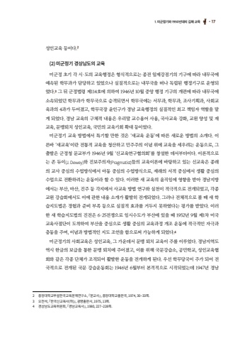 %uc131%uc778%uad50%uc721 %ub4f1%uc774%ub2e4.2(2) %ubbf8%uad70%uc815%uae30 %uacbd%uc0c1%ub0a8%ub3c4%uc758 %uad50%uc721%ubbf8%uad70%uc815 %ucd08%uae30 %uac01 %uc2dc%u00b7%ub3c4%uc758 %uad50%uc721%ud589%uc815%uc740 %ud615%uc2dd%uc801%uc73c%ub85c%ub294 %uc885%uc804 %uc77c%uc81c%uac15%uc810%uae30%uc758 %uae30%uad6c%uc5d0 %ub530%ub77c %ub0b4%ubb34%uad6d%uc5d0 %uc608%uc18d%ub41c %ud559%ubb34%uacfc%uac00 %ub2f4%ub2f9%ud558%uace0 %uc788%uc5c8%uc73c%ub098 %uc2e4%uc9c8%uc801%uc73c%ub85c%ub294 %ub0b4%ubb34%uad6d%uc744 %ub5a0%ub098 %ub3c5%ub9bd%ub41c %ud589%uc815%uae30%uad6c%ub85c %uc6b4%uc601%ub418%uc5c8%ub2e4.3 %uadf8 %ub4a4 %uad70%uc815%ubc95%ub839 %uc81c114%ud638%uc5d0 %uc758%ud558%uc5ec 1946%ub144 10%uc6d4 %uc911%uc559 %ud589%uc815 %uae30%uad6c%uc758 %uac1c%ud3b8%uc5d0 %ub530%ub77c %ub0b4%ubb34%uad6d%uc5d0 %uc18c%uc18d%ub418%uc5c8%ub358 %ud559%ubb34%uacfc%uac00 %ud559%ubb34%uad6d%uc73c%ub85c %uc2b9%uaca9%ub418%uba74%uc11c %ud559%ubb34%uad6d%uc5d0%ub294 %uc11c%ubb34%uacfc, %ud559%ubb34%uacfc, %uc870%uc0ac%uae30%ud68d%uacfc, %uc0ac%ud68c%uad50%uc721%uacfc%uc758 4%uacfc%uac00 %ub450%uc5b4%uc84c%uace0, %ud559%ubb34%uad6d%uc7a5 %uc724%uc778%uad6c%uac00 %uacbd%ub0a8 %uad50%uc721%ud589%uc815%uc758 %uc2e4%uc9c8%uc801%uc778 %ucd5c%uace0 %ucc45%uc784%uc790 %uc5ed%ud560%uc744 %ub9e1%uac8c %ub418%uc5c8%ub2e4. %uacbd%ub0a8 %uad50%uc721%uc758 %uad6c%uccb4%uc801 %ub0b4%uc6a9%uc740 %uc6b0%ub9ac%ub9d0 %uad50%uc218%uc6a9%uc5b4 %uc0ac%uc6a9, %uad6d%uc0ac%uad50%uc721 %uac15%ud654, %uad50%uc6d0 %uc591%uc131 %ubc0f %uc7ac%uad50%uc721, %ubb38%ub9f9%ud1f4%uce58 %uc131%uc778%uad50%uc721, %uad6d%ubbfc%uc758 %uad50%uc721%uae30%ud68c %ud655%ub300 %ub4f1%uc774%uc5c8%ub2e4.%ubbf8%uad70%uc815%uae30 %uad50%uc721 %ubc29%ubc95%uc5d0%uc11c %ud2b9%uae30%ud560 %ub9cc%ud55c %uac83%uc740 %u2018%uc0c8%uad50%uc721 %uc6b4%ub3d9%u2019%uc5d0 %ub530%ub978 %uc0c8%ub85c%uc6b4 %ubc29%ubc95%uc758 %uc18c%uac1c%ub2e4. %uc774%ub978%ubc14 %u2018%uc0c8%uad50%uc721%u2019%uc774%ub780 %uc804%ud1b5%uc801 %uad50%uc721%uc744 %uccad%uc0b0%ud558%uace0 %ubbfc%uc8fc%uc8fc%uc758 %uc774%ub150 %uc704%uc5d0 %uad50%uc721%uc744 %uc138%uc6b0%ub824%ub294 %uc6b4%ub3d9%uc73c%ub85c, %uadf8 %ucd9c%ubc1c%uc740 %uad70%uc815%uccad %ubb38%uad50%ubd80%uac00 1946%ub144 9%uc6d4 %u2018%uc2e0%uad50%uc721%uc5f0%uad6c%ud611%uc758%ud68c%u2019%ub97c %ucc3d%uc124%ud55c %ub370%uc11c%ubd80%ud130%uc774%ub2e4. %uc774%ub860%uc801%uc73c%ub85c%ub294 %uc874 %ub4c0%uc774(J. Dewey)%uc640 %uc9c4%ubcf4%uc8fc%uc758%uc790(Pragmatist)%ub4e4%uc758 %uad50%uc721%uc774%ub860%uc5d0 %ubc14%ud0d5%ud558%uace0 %uc788%ub294 %uc2e0%uad50%uc721%uc740 %uc885%ub798%uc758 %uad50%uc0ac %uc911%uc2ec%uc758 %uc218%uc5c5%ubc29%uc2dd%uc5d0%uc11c %uc544%ub3d9 %uc911%uc2ec%uc758 %uc218%uc5c5%ubc29%uc2dd%uc73c%ub85c, %uc7ac%ub798%uc758 %uc11c%uc801 %uc911%uc2ec%uc5d0%uc11c %uc0dd%ud65c %uc911%uc2ec%uc758 %uc218%uc5c5%uc73c%ub85c %uc804%ud658%ud558%ub824%ub294 %uc6b4%ub3d9%uc774%ub77c %ud560 %uc218 %uc788%ub2e4. %uc774%ub7ec%ud55c %uc0c8 %uad50%uc721%uc758 %uc6c0%uc9c1%uc784%uc5d0 %uc601%ud5a5%uc744 %ubc1b%uc544 %uacbd%ub0a8%uc9c0%ubc29%uc5d0%uc11c%ub294 %ubd80%uc0b0, %ub9c8%uc0b0, %uc9c4%uc8fc %ub4f1 %uac01%uc9c0%uc5d0%uc11c %uc0ac%uad50%uc721 %ubc29%ubc95 %uc5f0%uad6c%uc640 %uc2e4%ucc9c%uc774 %uc801%uadf9%uc801%uc73c%ub85c %uc804%uac1c%ub418%uc5c8%uace0, %uac01%uc885 %uad50%uc6d0 %uac15%uc2b5%ud68c%uc5d0%uc11c%ub3c4 %uc774%uc5d0 %uad00%ud55c %ub0b4%uc6a9 %uc18c%uac1c%uac00 %ud65c%ubc1c%ud788 %uc804%uac1c%ub418%uc5c8%ub2e4. %uadf8%ub7ec%ub098 %uc804%uccb4%uc801%uc73c%ub85c %ubcfc %ub54c %uc0c8 %ud559%uc2b5%uc9c0%ub3c4%ubc95%uc740 %uacbd%ud5d8%uacfc %uc900%ube44 %ubd80%uc871 %ub4f1%uc73c%ub85c %uc2e4%uc9c8%uc801 %ud6a8%uacfc%ub97c %uac70%ub450%uc9c0 %ubabb%ud558%uc600%ub2e4%ub294 %ud3c9%uac00%ub97c %ubc1b%uc558%ub2e4. %uc774%ub7ec%ud55c %uc0c8 %ud559%uc2b5%uc9c0%ub3c4%ubc95%uc758 %uc9c4%uc804%uc740 6%u00b725%uc804%uc7c1%uc73c%ub85c %uc784%uc2dc%uc218%ub3c4%uac00 %ubd80%uc0b0%uc5d0 %uc788%uc744 %ub54c 1952%ub144 9%uc6d4 %uc81c1%ucc28 %ubbf8%uad6d%uad50%uc721%uc0ac%uc808%ub2e8%uc774 %ub3c4%ucc29%ud558%uc5ec %ubd80%uc0b0%uc744 %uc911%uc2ec%uc73c%ub85c %uc0dd%ud65c %uc911%uc2ec%uc758 %uad50%uc721%uacfc%uc815 %uac1c%uc870 %uc6b4%ub3d9%uc5d0 %uc801%uadf9%uc801%uc778 %uc790%uadf9%uacfc %ucda9%ub3d9%uc744 %uc8fc%uba70, %uc774%ub150%uacfc %ubc29%ubc95%uc801%uc778 %uc9c0%ub3c4 %uc870%uc5b8%uc744 %ud568%uc73c%ub85c%uc368 %uac00%ub2a5%ud558%uac8c %ub418%uc5c8%ub2e4.4%ubbf8%uad70%uc815%uae30%uc758 %uc0ac%ud68c%uad50%uc721%uc740 %uc131%uc778%uad50%uc721, %uadf8 %uac00%uc6b4%ub370%uc11c %ubb38%ub9f9 %ud1f4%uce58 %uad50%uc721%uc774 %uc8fc%ub97c %uc774%ub8e8%uc5c8%ub2e4. %uacbd%ub0a8%uc9c0%uc5ed%ub3c4 %uc5ed%uc2dc %ud55c%uae00%uc758 %ubcf4%uae09%uc744 %ud1b5%ud55c %ubb38%ub9f9 %ud1f4%uce58%uc5d0 %uc8fc%uc5b4%uc84c%uace0, %uc774%ub97c %uc704%ud574 %uad6d%ubb38%uac15%uc2b5%uc18c, %uacf5%ubbfc%ud559%uad50, %uc131%uc778%uad50%uc721%ud611%ud68c%uc640 %uac19%uc740 %uac01%uc885 %ub2e8%uccb4%uac00 %uc870%uc9c1%ub418%uc5b4 %ud65c%ubc1c%ud55c %uc6b4%ub3d9%uc744 %uc804%uac1c%ud558%uac8c %ub41c%ub2e4. %uc6b0%uc120 %ud559%ubb34%ub2f9%uad6d%uc774 %uc8fc%uac00 %ub418%uc5b4 %uc804%uad6d%uc801%uc73c%ub85c %uc804%uac1c%ub41c %uad6d%ubb38 %uac15%uc2b5%uc6b4%ub3d9%ud68c%ub294 1946%ub144 6%uc6d4%ubd80%ud130 %ubcf8%uaca9%uc801%uc73c%ub85c %uc2dc%uc791%ub418%uc5c8%ub294%ub370 1947%ub144 %uacbd%ub0a82%u3000 %uc911%uc559%ub300%ud559%uad50%ubd80%uc124%ud55c%uad6d%uad50%uc721%ubb38%uc81c%uc5f0%uad6c%uc18c, %u300e%ubb38%uad50%uc0ac%u300f, %uc911%uc559%ub300%ud559%uad50%ucd9c%ud310%uad6d, 1974, 30~33%ucabd.3%u3000 %uc624%ucc9c%uc11d, %u300e%ud55c%uad6d%uc2e0%uad50%uc721%uc0ac(%ud558)%u300f, %uad11%uba85%ucd9c%ud310%uc0ac, 1975, 13%ucabd.4%u3000 %uacbd%uc0c1%ub0a8%ub3c4%uad50%uc721%uc704%uc6d0%ud68c, %u300e%uacbd%ub0a8%uad50%uc721%uc0ac%u300f, 1980, 227~228%ucabd.1. %ubbf8%uad70%uc815%uae30%uc640 1950%ub144%ub300%uc758 %uae40%ud574 %uad50%uc721 %u202217