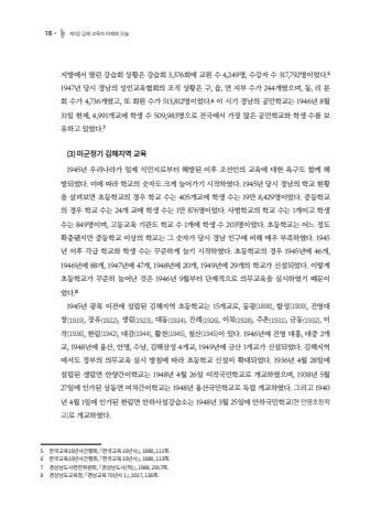 %uc9c0%ubc29%uc5d0%uc11c %uc5f4%ub9b0 %uac15%uc2b5%ud68c %uc0c1%ud669%uc740 %uac15%uc2b5%ud68c 3,376%ud68c%uc5d0 %uad50%uc6d0 %uc218 4,249%uba85, %uc218%uac15%uc790 %uc218 317,792%uba85%uc774%uc5c8%ub2e4.51947%ub144 %ub2f9%uc2dc %uacbd%ub0a8%uc758 %uc131%uc778%uad50%uc721%ud611%ud68c%uc758 %uc870%uc9c1 %uc0c1%ud669%uc740 %uad6c, %uc74d, %uba74 %uc9c0%ubd80 %uc218%uac00 244%uac1c%uc600%uc73c%uba70, %ub3d9, %ub9ac %ubd84%ud68c %uc218%uac00 4,736%uac1c%uc600%uace0, %ub610 %ud68c%uc6d0 %uc218%uac00 513,812%uba85%uc774%uc5c8%ub2e4.6 %uc774 %uc2dc%uae30 %uacbd%ub0a8%uc758 %uacf5%ubbfc%ud559%uad50%ub294 1946%ub144 8%uc6d4 31%uc77c %ud604%uc7ac, 4,991%uac1c%uad50%uc5d0 %ud559%uc0dd %uc218 509,983%uba85%uc73c%ub85c %uc804%uad6d%uc5d0%uc11c %uac00%uc7a5 %ub9ce%uc740 %uacf5%ubbfc%ud559%uad50%uc640 %ud559%uc0dd %uc218%ub97c %ubcf4%uc720%ud558%uace0 %uc788%uc5c8%ub2e4.7(3) %ubbf8%uad70%uc815%uae30 %uae40%ud574%uc9c0%uc5ed %uad50%uc7211945%ub144 %uc6b0%ub9ac%ub098%ub77c%uac00 %uc77c%uc81c %uc2dd%ubbfc%uc9c0%ub85c%ubd80%ud130 %ud574%ubc29%ub41c %uc774%ud6c4 %uc870%uc120%uc778%uc758 %uad50%uc721%uc5d0 %ub300%ud55c %uc695%uad6c%ub3c4 %ud568%uaed8 %ud574%ubc29%ub418%uc5c8%ub2e4. %uc774%uc5d0 %ub530%ub77c %ud559%uad50%uc758 %uc22b%uc790%ub3c4 %ud06c%uac8c %ub298%uc5b4%uac00%uae30 %uc2dc%uc791%ud558%uc600%ub2e4. 1945%ub144 %ub2f9%uc2dc %uacbd%ub0a8%uc758 %ud559%uad50 %ud604%ud669%uc744 %uc0b4%ud3b4%ubcf4%uba74 %ucd08%ub4f1%ud559%uad50%uc758 %uacbd%uc6b0 %ud559%uad50 %uc218%ub294 405%uac1c%uad50%uc5d0 %ud559%uc0dd %uc218%ub294 19%ub9cc 8,429%uba85%uc774%uc5c8%ub2e4. %uc911%ub4f1%ud559%uad50%uc758 %uacbd%uc6b0 %ud559%uad50 %uc218%ub294 24%uac1c %uad50%uc5d0 %ud559%uc0dd %uc218%ub294 1%ub9cc 876%uba85%uc774%uc5c8%ub2e4. %uc0ac%ubc94%ud559%uad50%uc758 %ud559%uad50 %uc218%ub294 1%uac1c%uc774%uace0 %ud559%uc0dd %uc218%ub294 849%uba85%uc774%uba70, %uace0%ub4f1%uad50%uc721 %uae30%uad00%ub3c4 %ud559%uad50 %uc218 1%uac1c%uc5d0 %ud559%uc0dd %uc218 203%uba85%uc774%uc5c8%ub2e4. %ucd08%ub4f1%ud559%uad50%ub294 %uc5b4%ub290 %uc815%ub3c4 %ud655%ucda9%ub410%uc9c0%ub9cc %uc911%ub4f1%ud559%uad50 %uc774%uc0c1%uc758 %ud559%uad50%ub294 %uadf8 %uc22b%uc790%uac00 %ub2f9%uc2dc %uacbd%ub0a8 %uc778%uad6c%uc5d0 %ube44%ud574 %ub9e4%uc6b0 %ubd80%uc871%ud558%uc600%ub2e4. 1945%ub144 %uc774%ud6c4 %uac01%uae09 %ud559%uad50%uc640 %ud559%uc0dd %uc218%ub294 %uafb8%uc900%ud558%uac8c %ub298%uae30 %uc2dc%uc791%ud558%uc600%ub2e4. %ucd08%ub4f1%ud559%uad50%uc758 %uacbd%uc6b0 1945%ub144%uc5d0 46%uac1c, 1946%ub144%uc5d0 88%uac1c, 1947%ub144%uc5d0 47%uac1c, 1948%ub144%uc5d0 20%uac1c, 1949%ub144%uc5d0 29%uac1c%uc758 %ud559%uad50%uac00 %uc2e0%uc124%ub418%uc5c8%ub2e4. %uc774%ub807%uac8c %ucd08%ub4f1%ud559%uad50%uac00 %uafb8%uc900%ud788 %ub298%uc5b4%ub09c %uac83%uc740 1946%ub144 9%uc6d4%ubd80%ud130 %ub2e8%uacc4%uc801%uc73c%ub85c %uc758%ubb34%uad50%uc721%uc744 %uc2e4%uc2dc%ud558%uc600%uae30 %ub54c%ubb38%uc774%uc5c8%ub2e4.81945%ub144 %uad11%ubcf5 %uc774%uc804%uc5d0 %uc124%ub9bd%ub41c %uae40%ud574%uc9c0%uc5ed %ucd08%ub4f1%ud559%uad50%ub294 15%uac1c%uad50%ub85c, %ub3d9%uad11(1898), %ud569%uc131(1909), %uc9c4%uc601%ub300%ucc3d(1919), %uc7a5%uc720(1922), %uc0dd%ub9bc(1923), %ub300%ub3d9(1924), %uc9c4%ub840(1926), %uc774%ubd81(1928), %uc8fc%ucd0c(1931), %uae08%ub3d9(1932), %uc774%uc791(1936), %ud55c%ub9bc(1942), %ub300%uac10(1944), %ud65c%ucc9c(1945), %uce60%uc0b0(1945)%uc774 %uc788%ub2e4. 1946%ub144%uc5d0 %uc9c4%uc601 %ub300%ud765, %ub300%uc911 2%uac1c %uad50, 1948%ub144%uc5d0 %uc6a9%uc0b0, %uc548%uba85, %uc218%ub0a8, %uae40%ud574%uc0bc%uc131 4%uac1c%uad50, 1949%ub144%uc5d0 %uae08%uc0b0 1%uac1c%uad50%uac00 %uc2e0%uc124%ub418%uc5c8%ub2e4. %uae40%ud574%uc9c0%uc5ed%uc5d0%uc11c%ub3c4 %uc815%ubd80%uc758 %uc758%ubb34%uad50%uc721 %uc2e4%uc2dc %ubc29%uce68%uc5d0 %ub530%ub77c %ucd08%ub4f1%ud559%uad50 %uc2e0%uc124%uc774 %ud655%ub300%ub418%uc5c8%ub2e4. 1936%ub144 4%uc6d4 28%uc77c%uc5d0 %uc124%ub9bd%ub41c %uc0dd%ub9bc%uba74 %uc548%uc591%uac04%uc774%ud559%uad50%ub294 1948%ub144 4%uc6d4 26%uc77c %uc774%uc791%uad6d%ubbfc%ud559%uad50%ub85c %uac1c%uad50%ud558%uc600%uc73c%uba70, 1938%ub144 5%uc6d4 27%uc77c%uc5d0 %uc778%uac00%ub41c %uc0c1%ub3d9%uba74 %uc5ec%ucc28%uac04%uc774%ud559%uad50%ub294 1948%ub144 %uc6a9%uc0b0%uad6d%ubbfc%ud559%uad50%ub85c %ub3c5%ub9bd %uac1c%uad50%ud558%uc600%ub2e4. %uadf8%ub9ac%uace0 1940%ub144 4%uc6d4 1%uc77c%uc5d0 %uc778%uac00%ub41c %ud55c%ub9bc%uba74 %uc548%ud558%uc0ac%uc124%uac15%uc2b5%uc18c%ub294 1948%ub144 3%uc6d4 25%uc77c%uc5d0 %uc548%ud558%uad6d%ubbfc%ud559%uad50(%ud604 %uc548%uba85%ucd08%ub4f1%ud559%uad50)%ub85c %uac1c%uad50%ud558%uc600%ub2e4.5%u3000 %ud55c%uad6d%uad50%uc72110%ub144%uc0ac%uac04%ud589%ud68c, %u300e%ud55c%uad6d%uad50%uc721 10%ub144%uc0ac%u300f, 1980, 111%ucabd.6%u3000 %ud55c%uad6d%uad50%uc72110%ub144%uc0ac%uac04%ud589%ud68c, %u300e%ud55c%uad6d%uad50%uc721 10%ub144%uc0ac%u300f, 1980, 113%ucabd.7%u3000 %uacbd%uc0c1%ub0a8%ub3c4%uc0ac%ud3b8%ucc2c%uc704%uc6d0%ud68c, %u300e%uacbd%uc0c1%ub0a8%ub3c4%uc0ac(%ud558)%u300f, 1988, 2917%ucabd.8%u3000 %uacbd%uc0c1%ub0a8%ub3c4%uad50%uc721%uccad, %u300e%uacbd%ub0a8%uad50%uc721 70%ub144%uc0ac 1%u300f, 2017, 136%ucabd.18%u2022 %uc81c1%uc7a5 %uae40%ud574 %uad50%uc721%uc758 %uc5b4%uc81c%uc640 %uc624%ub298