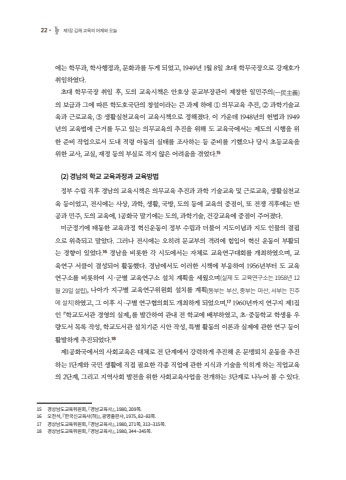 %uc5d0%ub294 %ud559%ubb34%uacfc, %ud559%uc0ac%ud589%uc815%uacfc, %ubb38%ud654%uacfc%ub97c %ub450%uac8c %ub418%uc5c8%uace0, 1949%ub144 1%uc6d4 8%uc77c %ucd08%ub300 %ud559%ubb34%uad6d%uc7a5%uc73c%ub85c %uac15%uc7ac%ud638%uac00 %ucde8%uc784%ud558%uc600%ub2e4.%ucd08%ub300 %ud559%ubb34%uad6d%uc7a5 %ucde8%uc784 %ud6c4, %ub3c4%uc758 %uad50%uc721%uc2dc%ucc45%uc740 %uc548%ud638%uc0c1 %ubb38%uad50%ubd80%uc7a5%uad00%uc774 %uc81c%ucc3d%ud55c %uc77c%ubbfc%uc8fc%uc758(%u4e00%u6c11%u4e3b%u7fa9)%uc758 %ubcf4%uae09%uacfc %uadf8%uc5d0 %ub530%ub978 %ud559%ub3c4%ud638%uad6d%ub2e8%uc758 %ucc3d%uc124%uc774%ub77c%ub294 %ud070 %uacfc%uc81c %ud558%uc5d0 %u2460 %uc758%ubb34%uad50%uc721 %ucd94%uc9c4, %u2461 %uacfc%ud559%uae30%uc220%uad50%uc721%uacfc %uadfc%ub85c%uad50%uc721, %u2462 %uc0dd%ud65c%uc2e4%ucc9c%uad50%uc721%uc774 %uad50%uc721%uc2dc%ucc45%uc73c%ub85c %uc815%ud574%uc84c%ub2e4. %uc774 %uac00%uc6b4%ub370 1948%ub144%uc758 %ud5cc%ubc95%uacfc 1949%ub144%uc758 %uad50%uc721%ubc95%uc5d0 %uadfc%uac70%ub97c %ub450%uace0 %uc788%ub294 %uc758%ubb34%uad50%uc721%uc758 %ucd94%uc9c4%uc744 %uc704%ud574 %ub3c4 %uad50%uc721%uad6d%uc5d0%uc11c%ub294 %uc81c%ub3c4%uc758 %uc2dc%ud589%uc744 %uc704%ud55c %uc900%ube44 %uc791%uc5c5%uc73c%ub85c%uc11c %ub3c4%ub0b4 %uc801%ub839 %uc544%ub3d9%uc758 %uc2e4%ud0dc%ub97c %uc870%uc0ac%ud558%ub294 %ub4f1 %uc900%ube44%ub97c %uae30%ud588%uc73c%ub098 %ub2f9%uc2dc %ucd08%ub4f1%uad50%uc721%uc744 %uc704%ud55c %uad50%uc0ac, %uad50%uc2e4, %uc7ac%uc815 %ub4f1%uc758 %ubd80%uc2e4%ub85c %uc801%uc9c0 %uc54a%uc740 %uc5b4%ub824%uc6c0%uc744 %uacaa%uc5c8%ub2e4.15(2) %uacbd%ub0a8%uc758 %ud559%uad50 %uad50%uc721%uacfc%uc815%uacfc %uad50%uc721%ubc29%ubc95%uc815%ubd80 %uc218%ub9bd %uc9c1%ud6c4 %uacbd%ub0a8%uc758 %uad50%uc721%uc2dc%ucc45%uc740 %uc758%ubb34%uad50%uc721 %ucd94%uc9c4%uacfc %uacfc%ud559 %uae30%uc220%uad50%uc721 %ubc0f %uadfc%ub85c%uad50%uc721, %uc0dd%ud65c%uc2e4%ucc9c%uad50%uc721 %ub4f1%uc774%uc5c8%uace0, %uc804%uc2dc%uc5d0%ub294 %uc0ac%uc0c1, %uacfc%ud559, %uc0dd%ud65c, %uad6d%ubc29, %ub3c4%uc758 %ub4f1%uc5d0 %uad50%uc721%uc758 %uc911%uc810%uc774, %ub610 %uc804%uc7c1 %uc9c1%ud6c4%uc5d0%ub294 %ubc18%uacf5%uacfc %ubbfc%uc8fc, %ub3c4%uc758 %uad50%uc721%uc5d0, 1%uacf5%ud654%uad6d %ub9d0%uae30%uc5d0%ub294 %ub3c4%uc758, %uacfc%ud559%uae30%uc220, %uac74%uac15%uad50%uc721%uc5d0 %uc911%uc810%uc774 %uc8fc%uc5b4%uc84c%ub2e4.%ubbf8%uad70%uc815%uae30%uc5d0 %ud0dc%ub3d9%ud55c %uad50%uc721%uacfc%uc815 %ud601%uc2e0%uc6b4%ub3d9%uc774 %uc815%ubd80 %uc218%ub9bd%uacfc %ub354%ubd88%uc5b4 %uc9c0%ub3c4%uc774%ub150%uacfc %uc9c0%ub3c4 %uc778%ubb3c%uc758 %uacb0%ud54d%uc73c%ub85c %uc704%ucd95%ub418%uace0 %ub9d0%uc558%ub2e4. %uadf8%ub7ec%ub098 %uc804%uc2dc%uc5d0%ub294 %uc624%ud788%ub824 %ubb38%uad50%ubd80%uc758 %uaca9%ub824%uc5d0 %ud798%uc785%uc5b4 %ud601%uc2e0 %uc6b4%ub3d9%uc774 %ubd80%ud65c%ub418%ub294 %uacbd%ud5a5%uc774 %uc788%uc5c8%ub2e4.16 %uacbd%ub0a8%uc744 %ube44%ub86f%ud55c %uac01 %uc2dc%ub3c4%uc5d0%uc11c%ub294 %uc790%uccb4%ub85c %uad50%uc721%uc5f0%uad6c%ub300%ud68c%ub97c %uac1c%ucd5c%ud558%uc600%uc73c%uba70, %uad50%uc721%uc5f0%uad6c %uc11c%ud074%uc774 %uacb0%uc131%ub418%uc5b4 %ud65c%ub3d9%ud588%ub2e4. %uacbd%ub0a8%uc5d0%uc11c%ub3c4 %uc774%ub7ec%ud55c %uc2dc%ucc45%uc5d0 %ubd80%uc751%ud558%uc5ec 1956%ub144%ubd80%ud130 %ub3c4 %uad50%uc721%uc5f0%uad6c%uc18c%ub97c %ube44%ub86f%ud558%uc5ec %uc2dc%u00b7%uad70%ubcc4 %uad50%uc721%uc5f0%uad6c%uc18c %uc124%uce58 %uacc4%ud68d%uc744 %uc138%uc6e0%uc73c%uba70(%uc2e4%uc81c %ub3c4 %uad50%uc721%uc5f0%uad6c%uc18c%ub294 1958%ub144 12%uc6d4 29%uc77c %uc124%ub9bd), %ub098%uc544%uac00 %uc9c0%uad6c%ubcc4 %uad50%uc721%uc5f0%uad6c%uc704%uc6d0%ud68c %uc124%uce58%ub97c %uacc4%ud68d(%ub3d9%ubd80%ub294 %ubd80%uc0b0, %uc911%ubd80%ub294 %ub9c8%uc0b0, %uc11c%ubd80%ub294 %uc9c4%uc8fc%uc5d0 %uc124%uce58)%ud558%uc600%uace0, %uadf8 %uc774%ud6c4 %uc2dc%u00b7%uad6c%ubcc4 %uc5f0%uad6c%ud611%uc758%ud68c%ub3c4 %uac1c%ucd5c%ud558%uac8c %ub418%uc5c8%uc73c%uba70,17 1960%ub144%uae4c%uc9c0 %uc5f0%uad6c%uc9c0 %uc81c1%uc9d1%uc778 %u300e%ud559%uad50%ub3c4%uc11c%uad00 %uacbd%uc601%uc758 %uc2e4%uc81c%u300f%ub97c %ubc1c%uac04%ud558%uc5ec %uad00%ub0b4 %uc804 %ud559%uad50%uc5d0 %ubc30%ubd80%ud558%uc600%uace0, %ucd08%u00b7%uc911%ub4f1%ud559%uad50 %ud559%uc0dd%uc6a9 %uc6b0%ub7c9%ub3c4%uc11c %ubaa9%ub85d %uc791%uc131, %ud559%uad50%ub3c4%uc11c%uad00 %uc124%uce58%uae30%uc900 %uc2dc%uc548 %uc791%uc131, %ud2b9%ubcc4 %ud65c%ub3d9%uc758 %uc774%ub860%uacfc %uc2e4%uc81c%uc5d0 %uad00%ud55c %uc5f0%uad6c %ub4f1%uc774 %ud65c%ubc1c%ud558%uac8c %ucd94%uc9c4%ub418%uc5c8%ub2e4.18%uc81c1%uacf5%ud654%uad6d%uc5d0%uc11c%uc758 %uc0ac%ud68c%uad50%uc721%uc740 %ub300%uccb4%ub85c %uc804 %ub2e8%uacc4%uc5d0%uc11c %uac15%ub825%ud558%uac8c %ucd94%uc9c4%ud574 %uc628 %ubb38%ub9f9%ud1f4%uce58 %uc6b4%ub3d9%uc744 %ucd94%uc9c4%ud558%ub294 1%ub2e8%uacc4%uc640 %uad6d%ubbfc %uc0dd%ud65c%uc5d0 %uc9c1%uc811 %ud544%uc694%ud55c %uac01%uc885 %uc9c1%uc5c5%uc5d0 %uad00%ud55c %uc9c0%uc2dd%uacfc %uae30%uc220%uc744 %uc775%ud788%uac8c %ud558%ub294 %uc9c1%uc5c5%uad50%uc721%uc758 2%ub2e8%uacc4, %uadf8%ub9ac%uace0 %uc9c0%uc5ed%uc0ac%ud68c %ubc1c%uc804%uc744 %uc704%ud55c %uc0ac%ud68c%uad50%uc721%uc0ac%uc5c5%uc744 %uc804%uac1c%ud558%ub294 3%ub2e8%uacc4%ub85c %ub098%ub204%uc5b4 %ubcfc %uc218 %uc788%ub2e4. 15%u3000 %uacbd%uc0c1%ub0a8%ub3c4%uad50%uc721%uc704%uc6d0%ud68c, %u300e%uacbd%ub0a8%uad50%uc721%uc0ac%u300f, 1980, 209%ucabd.16%u3000 %uc624%ucc9c%uc11d, %u300e%ud55c%uad6d%uc2e0%uad50%uc721%uc0ac(%ud558)%u300f, %uad11%uba85%ucd9c%ud310%uc0ac, 1975, 82~83%ucabd.17%u3000 %uacbd%uc0c1%ub0a8%ub3c4%uad50%uc721%uc704%uc6d0%ud68c, %u300e%uacbd%ub0a8%uad50%uc721%uc0ac%u300f, 1980, 271%ucabd, 313~315%ucabd.18%u3000 %uacbd%uc0c1%ub0a8%ub3c4%uad50%uc721%uc704%uc6d0%ud68c, %u300e%uacbd%ub0a8%uad50%uc721%uc0ac%u300f, 1980, 344~345%ucabd.22%u2022 %uc81c1%uc7a5 %uae40%ud574 %uad50%uc721%uc758 %uc5b4%uc81c%uc640 %uc624%ub298