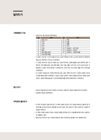 %uae30%ud68d%ubc29%ud5a5%uacfc %uad6c%uc131 %u2022 %uae40%ud574%uc2dc%uc0ac%ub294 %ucd1d 15%uad8c%uc73c%ub85c %uc81c%uc791%ub418%uc5c8%ub2e4.%uad8c %uc81c%ubaa9 %uad8c %uc81c%ubaa91 %ud658%uacbd%u00b7%uc120%uc0ac 9 %uc790%ub7912 %uac00%uc57c 10 %uc778%ubb3c3 %uace0%ub824 11 %uc0dd%ud65c4 %uc870%uc120 12 %uc2dc%ubbfc5 %uadfc%ub300 13 %uc790%ub8cc%uc9d1 1 - %uc0ac%uc9c4%u00b7%uc9c0%ub3c46 %ud604%ub300 14 %uc790%ub8cc%uc9d1 2 - %uc804%uadfc%ub3007 %uc815%uce58%u00b7%ud589%uc815%u00b7%uacbd%uc81c 15 %uc790%ub8cc%uc9d1 3 - %uadfc%ud604%ub300%u00b7%ud604%ud6698 %uad50%uc721%u00b7%ubb38%ud654%u00b7%uc608%uc220%u2022 1~6%uad8c%uc740 %uc2dc%ub300%uc0ac%ub85c %u2018%uc2dc%uac04%uc758 %ud750%ub984%uc73c%ub85c %ubcf4%ub294 %uae40%ud574 %uc9c0%uc5ed%ubcc0%ucc9c%uc0ac%u2019%uc774%uba70, %uc120%uc0ac%ubd80%ud130 %ud604%ub300%uae4c%uc9c0 %ubd84%ub958%ud558%uc5ec %ud3ed%ub113%uace0%ub3c4 %uc804%ubb38%uc801%uc778 %uc2dc%uac01%uc73c%ub85c %uad6c%uc131%ud558%uc600%ub2e4.%u2022 7~12%uad8c%uc740 %ubd84%uc57c%uc0ac%ub85c %u2018%uacf5%uac04%uacfc %uc8fc%uccb4%ub85c %ubcf4%ub294 %uae40%ud574 %uc774%ubaa8%uc800%ubaa8, %uae40%ud574%uc0ac%ub78c%ub4e4%uc758 %uc0b6%uacfc %ubb38%ud654%u2019%uc5d0 %uad00%ud55c %uae30%ub85d%uc774%uba70, %u2018%uc815%uce58%u00b7%ud589%uc815%u00b7%uacbd%uc81c, %uad50%uc721%u00b7%ubb38%ud654%u00b7%uc608%uc220, %uc790%ub791, %uc778%ubb3c, %uc0dd%ud65c, %uc2dc%ubbfc%u2019%uc73c%ub85c %ub098%ub204%uc5b4 %ube44%uad50%uc801 %uc27d%uac8c %uc11c%uc220%ud558%uc600%ub2e4. 12%uad8c%uc740 %uc2dc%ubbfc%uc758 %ucc38%uc5ec%ub85c %uad6c%uc131%ud558%uc600%uc73c%uba70, %uc2dc%ubbfc%uc774 %ubcf4%ub294 %uc5ed%uc0ac, %ubb38%ud654, %uc0dd%ud65c, %ucd94%uc5b5, %uc8fc%uc7a5 %ub4f1%uc744 %uc218%ub85d%ud558%uc600%ub2e4.%u2022 13~15%uad8c%uc740 %uc790%ub8cc%uc9d1%uc73c%ub85c %u2018%uc790%ub8cc%uc640 %ud754%uc801%uc73c%ub85c %uc77d%ub294 %uae40%ud574 %uae30%ub85d%uc758 %uc5ed%uc0ac%u2019%uc774%ub2e4. 13%uad8c%uc740 %uae40%ud574%uc758 %uc0ac%uc9c4%uacfc %uc9c0%ub3c4%ub97c %ud574%uc81c%uc640 %ud568%uaed8 %uc218%ub85d%ud558%uc600%ub2e4. 14%uad8c%uacfc 15%uad8c%uc740 %uae40%ud574%uc758 %uae30%ub85d%uacfc %ubb38%ud5cc%uc744 %uc815%ub9ac%ud558%uace0 %ud574%uc81c%ub3c4 %ucca8%ubd80%ud558%uc600%ub2e4. %uae40%ud574%uc758 %ubcc0%ud654%uc0c1%uc744 %ubcfc %uc218 %uc788%uac8c %ubd84%uc57c%ubcc4 %ud1b5%uacc4%ub97c %uc815%ub9ac%ud55c %ud604%ud669%uc790%ub8cc%ub3c4 %uc218%ub85d%ud558%uc600%ub2e4. %uc6d0%uace0 %ud45c%uae30%u2022 %ud55c%uae00 %ud45c%uae30%ub97c %uc6d0%uce59%uc73c%ub85c %ud558%uba70, %uc678%ub798%uc5b4%ub098 %uc678%uad6d%uc5b4%ub294 %ud45c%uc900%uc801%uc778 %uad6d%ubb38%ud45c%uae30%ubc95%uc5d0 %ub530%ub77c %ud45c%uae30%ud558%uc600%ub2e4.%u2022 %uc778%uba85%uc5d0%uc11c %uc874%uce6d%uc740 %uc0dd%ub7b5%ud558%uc600%ub2e4.%uc800%uc791%uad8c%uacfc %ucd9c%ucc98%ud45c%uae30%u2022 %uc774 %ucc45%uc758 %uc800%uc791%uad8c%uc740 %uae40%ud574%uc2dc%uc5d0 %uc788%ub2e4. %uc774 %ucc45%uc5d0 %uc0ac%uc6a9%ub41c %ub3c4%ud45c%uc640 %uc0ac%uc9c4 %uc790%ub8cc%uc5d0 %ub300%ud574%uc11c%ub294 %ucd9c%ucc98%uc640 %uc6d0 %uc800%uc791%uad8c%uc790%ub97c %ud45c%uc2dc%ud574 %ub450%uc5c8%uc73c%uba70, %ucd9c%ucc98%ub97c %ud45c%uc2dc%ud558%uc9c0 %uc54a%uc740 %uac83%uc740 %uae40%ud574%uc2dc%uac00 %uc81c%uc791%u00b7%uc18c%uc7a5%ud558%uac70%ub098 %uc9d1%ud544%uc790%uac00 %uc81c%uacf5%ud55c %uc790%ub8cc%uc774%ub2e4. %u2022 %uc774 %ucc45%uc5d0 %uc218%ub85d%ub41c %ub0b4%uc6a9%uacfc %ub3c4%ud45c%uc640 %uc0ac%uc9c4%uc744 %uc774%uc6a9%ud560 %uacbd%uc6b0%uc5d0%ub294 %ubc18%ub4dc%uc2dc %ucd9c%ucc98%ub97c %ubc1d%ud600%uc57c %ud558%uba70, %uc0c1%uc5c5%uc801%uc73c%ub85c %uc774%uc6a9%ud560 %uc218 %uc5c6%ub2e4.%u2022 %ubcc4%ub3c4%uc758 %uc6d0 %uc800%uc791%uc790%uac00 %uc788%ub294 %uc790%ub8cc%uc5d0 %ub300%ud574%uc11c%ub294 %ud574%ub2f9 %uc800%uc791%uad8c%uc790%uc758 %ub3d9%uc758%ub97c %uad6c%ud574 %uc0ac%uc6a9%ud574%uc57c %ud55c%ub2e4.%uc77c%ub7ec%ub450%uae30