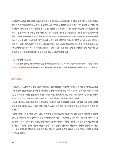 (%u4e3b%u6d66)%ub77c%uace0 %ubd80%ub978%ub2e4. %ucc98%uc74c %uc5b8%ub355 %uc704%uc5d0%uc11c %ube44%ub2e8 %ubc14%uc9c0%ub97c %ud47c %uacf3%uc740 %ub2a5%ud604(%u7dbe%u5cf4)%uc774%ub77c%uace0 %ud558%uba70, %ubd89%uc740 %uae43%ubc1c%uc774 %ucc98%uc74c %ub4e4%uc5b4%uc628 %ud574%uc548%uc740 %uae30%ucd9c%ubcc0(%u65d7%u51fa%u908a)%uc774%ub77c%uace0 %ud55c%ub2e4. %uc218%ub85c%uc655%uc774 %uadf8%ub97c %ub9de%uc774%ud558%uace0 %ud568%uaed8 %ub098%ub77c%ub97c %ub2e4%uc2a4%ub9b0 %uac83%uc774 150%uc5ec %ub144%uc774%uc5c8%ub2e4. %uc774%ub54c %ud574%ub3d9%uc5d0 %uc544%uc9c1 %uc808%uc744 %uc138%uc6b0%uace0 %ubd88%ubc95%uc744 %ubc1b%ub4dc%ub294 %uc77c%uc774 %uc5c6%uc5c8%ub2e4. %ub300%uac1c %ubd88%uad50%uac00 %uc544%uc9c1 %ub4e4%uc5b4%uc624%uc9c0 %ubabb%ud558%uc5ec %ud1a0%ucc29%uc778%ub4e4%uc774 %uc2e0%ubcf5%ud558%uc9c0 %uc54a%uc558%uc73c%ubbc0%ub85c %ubcf8%uae30%uc5d0%ub294 %uc808%uc744 %uc138%uc6e0%ub2e4%ub294 %uae30%ub85d%uc774 %uc5c6%ub2e4. %uc81c8%ub300 %uc9c8%uc9c0%uc655(%u928d%u77e5%u738b) 2%ub144 %uc784%uc9c4(452%ub144)%uc5d0 %uc774%ub974%ub7ec%uc11c%uc57c %uadf8 %ub545%uc5d0 %uc808%uc744 %uc138%uc6e0%ub2e4. %ub610 %uc655%ud6c4%uc0ac(%u738b%u540e%u5bfa)-%uc544%ub3c4(%u963f%u9053) %ub20c%uc9c0%uc655(%u8a25%u7947%u738b)%uc758 %uc2dc%ub300%ub85c %ubc95%ud765%uc655%ub300%uc758 %uc804%uc774%ub2e4-%ub97c %ucc3d%uac74%ud558%uc5ec %uc624%ub298%ub0a0%uc5d0 %uc774%ub974%uae30%uae4c%uc9c0 %ubcf5%uc744 %ube4c%uace0 %uacb8%ud558%uc5ec %ub0a8%ucabd%uc758 %uc65c%ub97c %uc9c4%uc555%ud558%uace0 %uc788%ub294%ub370 %uac00%ub77d%uad6d %ubcf8%uae30%uc5d0 %uc790%uc138%ud788 %ubcf4%uc778%ub2e4. %ud0d1%uc740 %ubaa8%uac00 4%uba74%uc73c%ub85c 5%uce35%uc774%uace0 %uadf8 %uc870%uac01%uc774 %ub9e4%uc6b0 %ud2b9%uc774%ud558%ub2e4. %ub3cc%uc5d0 %ubbf8%uc138%ud55c %ubd89%uc740 %ubc18%uc810 %uc0c9%uc774 %uc788%uace0 %uadf8 %uc9c8%uc740 %ubb34%ub974%ub2c8 %uc6b0%ub9ac%ub098%ub77c%uc5d0%uc11c %ub098%ub294 %uac83%uc774 %uc544%ub2c8%ub2e4. %u300e%ubcf8%ucd08(%u672c%u8349)%u300f%uc5d0%uc11c %ub9d0%ud558%ub294 %ub2ed%ubcbc%uc2ac%uc758 %ud53c%ub97c %ucc0d%uc5b4 %uac80%uc0ac%ud588%ub2e4%ub294 %uac83%uc774 %uc774%uac83%uc774%ub2e4. %uae08%uad00%uad6d%uc740 %ub610%ud55c %uac00%ub77d%uad6d(%u99d5%u6d1b%u570b)%uc774%ub77c%uace0%ub3c4 %ud558%ub294%ub370 %ubcf8%uae30%uc5d0 %uc790%uc138%ud788 %uc2e4%ub824 %uc788%ub2e4.%u25cb %uc5b4%uc0b0%ubd88%uc601 %uad8c3, %ud0d1%uc0c14%uace0%uae30(%u53e4%u8a18)%uc5d0 %ub9d0%ud558%uae38 %ub9cc%uc5b4%uc0ac(%u842c%u9b5a%u5bfa)%ub294 %uc61b %uc790%uc131%uc0b0(%u6148%u6210%u5c71)%uc774%uc694, %ub610 %uc544%uc57c%uc0ac%uc0b0(%u963f%u8036%u65af%u5c71)%uc778%ub370 %uadf8 %uacc1%uc5d0 %uac00%ub77c%uad6d(%u8a36%u56c9%u570b)%uc774 %uc788%uc5c8%ub2e4. %uc61b%ub0a0%uc5d0 %ud558%ub298%uc5d0%uc11c %uc54c%uc774 %ubc14%ub2f7%uac00%uc5d0 %ub0b4%ub824%uc640 %uc0ac%ub78c%uc774 %ub418%uc5b4 %ub098%ub77c%ub97c %ub2e4%uc2a4%ub838%uc73c%ub2c8 %uace7 %uc218%ub85c%uc655%uc774%ub2e4.3) %u300e%uace0%ub824%uc0ac%u300f%u300e%uace0%ub824%uc0ac%u300f%ub294 %uc870%uc120%uc804%uae30 %ubb38%uc2e0%uc778 %uae40%uc885%uc11c(%u91d1%u5b97%u745e), %uc815%uc778%uc9c0(%u912d%u9e9f%u8dbe), %uc774%uc120%uc81c(%u674e%u5148%u9f4a) %ub4f1%uc774 %uc138%uc885%uc758 %uc655%uba85%uc73c%ub85c %uace0%ub824%uc2dc%ub300 %uc804%ubc18%uc5d0 %uad00%ud55c %ub0b4%uc6a9%uc744 %uc815%ub9ac%ud558%uc5ec 1451%ub144%uc5d0 %ud3b8%ucc2c%ud558%uace0 1454%ub144 %uc815%uc778%uc9c0%uc758 %uc774%ub984%uc73c%ub85c %uc778%uc1c4 %ubc18%ud3ec%ub418%uc5c8%ub2e4. %u300e%uace0%ub824%uc0ac%u300f%ub294 %uc138%uac00(%u4e16%u5bb6) 46%uad8c, %uc5f4%uc804(%uf99c%u50b3) 50%uad8c, %uc9c0(%u5fd7) 39%uad8c, %uc5f0%ud45c(%uf98e%u8868) 2%uad8c, %ubaa9%ub85d(%u76ee%u9304) 2%uad8c%uc73c%ub85c %ucd1d 139%uad8c 75%ucc45%uc73c%ub85c %uad6c%uc131%ub418%uc5b4 %uc788%ub2e4. %uae40%ud574%uc640 %uad00%ub828%ub41c %uae30%ub85d%uc740 %uc138%uac00 39%uac74, %uc9c0 14%uac74, %uc5f4%uc804 24%uac74%uc774 %ud655%uc778%ub41c%ub2e4.%uccab%uc9f8, %uc138%uac00%uc5d0%ub294 %uc65c%uad6c %uce68%ubc94, %ubabd%uace0%uc758 %uc77c%ubcf8%uc6d0%uc815, %uc0bc%ubcc4%ucd08%uc758 %uce68%ub7b5%uacfc %uad00%ub828%ub41c %uae30%uc0ac%uac00 %uae30%ub85d%ub418%uc5b4 %uc788%ub2e4. %uc6d0%uc758 %uc77c%ubcf8%uc6d0%uc815%uacfc %uad00%ub828%ub41c %uae30%uc0ac%uac00 %ub2e4%uc218 %uae30%ub85d%ub41c %uac83%uc740 %uace0%ub824 %uc815%ubd80%uc5d0%uc11c %uc9c0%uc815%ud559%uc801%uc73c%ub85c %uae40%ud574%uc758 %uc911%uc694%uc131%uc744 %uc778%uc9c0%ud558%uace0 %uc788%uc74c%uc744 %ubcf4%uc5ec%uc900%ub2e4.%ub458%uc9f8, %uc9c0%uc5d0%ub294 %uc9c0%ub9ac, %ud589%uc815, %uad70%uc0ac, %uad50%ud1b5, %uc790%uc5f0%uc7ac%ud574 %ub4f1%uc774 %uae30%ub85d%ub418%uc5b4 %u300e%uc0bc%uad6d%uc0ac%uae30%u300f%ubcf4%ub2e4 %ud48d%ubd80%ud55c %ub0b4%uc6a9%uc774 %uc218%ub85d%ub418%uc5b4 %uc788%ub2e4. %uae08%uc8fc%uc5d0 %ub300%ud55c %uc9c0%ub9ac %uc815%ubcf4%uc640 %uc9c0%uc9c4 %ub4f1%uc758 %uc790%uc5f0%uc7ac%ud574%uac00 %u300e%uc0bc%uad6d%uc0ac%uae30%u300f%ubcf4%ub2e4 %uc0c1%uc138%ud788 %uae30%ub85d%ub418%uc5c8%uc73c%uba70, %uac00%ub77d%uad6d%uc758 %uac74%uad6d, %uba78%ub9dd %uadf8%ub9ac%uace0 %uc774%ud6c4%uc758 %uc74d%ud638(%u9091%u865f), %uc74d%uaca9(%u9091%u683c)%uc758 %ubcc0%ud654%uac00 %uc790%uc138%ud788 %uae30%uc7ac%ub418%uc5b4 %uc788%ub2e4. %uc218%ub85c%uc655%ubb18 %ub4f1%uc758 %uba85%uc2b9%uc9c0%uc5d0 %uad00%ud55c %ub0b4%uc6a9%ub3c4 %uae30%ub85d%ub418%uc5b4 %uc788%ub2e4. %uc9c0%ubc29%uc5d0 %ub300%ud55c %uae30%ub85d%uc774 %ub300%uccb4%ub85c %uc911%uc559%uc0ac %uad00%uc810%uc5d0%uc11c %uc11c%uc220%ub418%uc5b4 %uccb4%uc81c%uac00 %ud68d%uc77c%uc801%uc774%uace0 %ub0b4%uc6a9%uc774 %uc18c%ub7b5%ud55c %ud3b8%uc778%ub370%ub3c4 %ubd88%uad6c%ud558%uace0, %uae40%ud574%uc758 %uacbd%uc6b0%ub294 %uc5ed%uc0ac%uc801, %uc9c0%ub9ac%uc801 %uc911%uc694%uc131 %ub54c%ubb38%uc5d0 %ub2e4%uc591%ud55c %uc815%ubcf4%uac00 %uae30%ub85d%uc73c%ub85c %ub0a8%uaca8%uc9c4 %uac83%uc73c%ub85c %ubcf4%uc778%ub2e4.26 %u2160. %uc0ac%uc11c%ub85c %ubcf4%ub294 %uae40%ud574