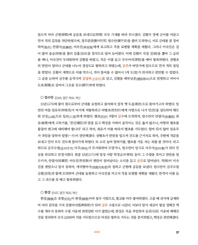 %uc77c%uc73c%ucf1c %uc5ec%ub7ec %uad70%ud604(%u90e1%u7e23)%uc5d0 %uacf5%ubb38%uc744 %ubcf4%ub0b4%ubbc0%ub85c[%u79fb%u7252] %ubaa8%ub450 %uae30%uc138%ub97c %ub530%ub77c %ubb34%ub108%uc84c%ub2e4. %uae40%ud6e4%uc774 %uc815%uc608 %uad70%uc0ac%ub97c %uc774%ub04c%uace0 %uba3c%uc800 %uc801%uc758 %uae38%ubaa9%uc744 %ucc28%ub2e8%ud558%uc600%uc73c%uba70, %uacbd%uc8fc%ud310%uad00(%u6176%u5dde%u5224%u5b98) %uc5c4%uc218%uc548(%u56b4%u5b88%u5b89)%uc744 %ubd88%ub7ec %ub3c4%ucc29%ud558%ub2c8, %uc11c%ub85c %uad70%ub300%ub97c %uc798 %uc815%ube44%ud558%uc5ec[%u52d2%u5175] %uc548%ub834%uc0ac(%u6309%u5ec9%u4f7f) %uc774%uc219%uc9c4(%u674e%u6dd1%u771e)%uc5d0%uac8c %ubcf4%uace0%ud558%uace0 %uc801%uc744 %ud1a0%ubc8c%ud560 %uacc4%ud68d%uc744 %uc138%uc6e0%ub2e4. %uadf8%ub7ec%ub098 %uc774%uc219%uc9c4%uc740 %uac81%uc774 %ub9ce%uc544 %uc220%uc2b9(%u8853%u50e7)%uc744 %ubd88%ub7ec %uae38%ud749(%u5409%u51f6)%uc744 %uc810%uce58%ubbc0%ub85c %uc77c%uc774 %ub2a6%uc5b4%uc84c%ub2e4. %uc774%uc5d0 %uae40%ud6e4%uc774 %uc9c1%uc811 %uac80(%u5292)%uc744 %ubf51%uc544 %uadf8 %uc2b9%ub824%ub97c %ubca0%ub2c8, %uc774%uc219%uc9c4%uc774 %ub450%ub824%uc6cc%ud558%uc5ec %uae40%ud6e4%uc744 %ub530%ub790%uace0, %uc801%uc740 %uc774%ub97c %ub4e3%uace0 %uc6b0%ub450%uba38%ub9ac[%u6e20%u9b41]%ub97c %ubca0%uc5b4 %ud56d%ubcf5%ud558%uc600%ub2e4. %uc0bc%ubcc4%ucd08%uc758 %ubc18%ub780%uc774 %uc77c%uc5b4%ub098 %uad70%ub300%ub97c %ub098%ub204%uc5b4 %uacbd%uc0c1%ub3c4%ub85c %ud5a5%ud558%ub824%uace0 %ud558%uc600%ub294%ub370, %uae08%uc8fc%uac00 %ubc14%ub2f7%uac00%uc5d0 %uc788%uc73c%ubbc0%ub85c %uba3c%uc800 %uc801%uc758 %uce68%uc785%uc744 %ubc1b%uc558%ub2e4. %uae40%ud6e4%uc774 %uacc4%ucc45%uc73c%ub85c %uc774%ub97c %ub9c9%uc73c%ub2c8, %uc801%uc774 %ub4e4%uc5b4%uc62c %uc218 %uc5c6%uc5b4%uc11c 1%uac1c %ub3c4(%u9053)%uac00 %uc758%uc9c0%ud558%uace0 %ud3b8%uc548%ud560 %uc218 %uc788%uc5c8%ub2e4. %uadf8 %uacf5%uc744 %ub17c%ud558%uc5ec %uae08%uc8fc%ub97c %uc2b9%uaca9%uc2dc%ucf1c %uae40%ub155%ubd80(%u91d1%u5be7%u5e9c)%ub85c %uc0bc%uace0, %uae40%ud6e4%uc744 %uc608%ubd80%ub0ad%uc911(%u79ae%u90e8%u90de%u4e2d)%uc73c%ub85c %uc784%uba85%ud558%uace0 %uc774%uc5b4%uc11c %ub3c4%ud638(%u90fd%u8b77)%ub85c %uc0bc%uc544%uc11c %uadf8%uacf3%uc744 %uc9c4%uc218(%u93ad%u5b88)%ud558%uac8c %ud558%uc600%ub2e4.%u25cb %uc5c4%uc218%uc548 %uad8c106, %uc5f4%uc804 %uc81c19, %uc81c%uc2e011%ub144(1270)%uc5d0 %uc655%uc774 %uc6d0%uc73c%ub85c%ubd80%ud130 %uad70%ub300%ub97c %uc694%uccad%ud558%uace0 %ub3cc%uc544%uc640%uc11c %uc7a5%ucc28 %uc61b %ub3c4%uc74d(%u90fd%u9091)%uc73c%ub85c %ub3cc%uc544%uac00%uace0%uc790 %ud558%uc600%ub2e4. %uc784%uc5f0%uc758 %uc544%ub4e4 %uc784%uc720%ubb34(%u6797%u60df%u8302)%uac00 %uc5ec%uae30%uc5d0 %uc800%ud56d%ud558%ub824%uace0 %uc57c%ubcc4%ucd08(%u591c%u5225%u6284)%uc5d0%uac8c %uc0ac%ubc29%uc73c%ub85c %ub098%uac00 %ubbfc(%u6c11)%uc744 %uc124%ub4dd%ud558%uc5ec %ud574%ub3c4%uc640 %uc0b0%uc131(%u5c71%u57ce)%uc73c%ub85c %uc785%ubcf4(%u5165%u4fdd)%ud558%uac8c %ud558%uc600%ub2e4. %ubcc4%ucd08(%u5225%u6284) 9%uba85%uc774 %uae08%uc8fc%uc5d0 %ub3c4%ucc29%ud558%uc790, %uc5c4%uc218%uc548%uc774 %uc548%ub834%uc0ac(%u6309%u5ec9%u4f7f) %ucd5c%uc720(%u5d14%u5112)%uc5d0%uac8c %uace0%ud558%uae30%ub97c, %u2018%uad8c%uc2e0(%u6b0a%u81e3)%uc758 %ub9d0%uc744 %ub4e3%uace0 %ubc31%uc131%uc744 %uac00%ubcbc%uc774 %uc6c0%uc9c1%uc774%ub294 %uac83%uc740 %uc633%uc9c0 %uc54a%uc73c%ub2c8, %ub9c8%ub545%ud788 %ubcc4%ucd08%ub97c %ubd99%uc7a1%uc544 %ubcc0%uace0%uc5d0 %ub300%ube44%ud574%uc57c %ud569%ub2c8%ub2e4%u2019 %ub77c%uace0 %ud558%uc790, %ucd5c%uc720%uac00 %uc774%ub97c %ub530%ub77c%uc11c %ubcc4%ucd08%ub97c %uac00%ub450%uc5c8%ub2e4. %uc5bc%ub9c8 %ub418%uc9c0 %uc54a%uc544 %uc784%uc720%ubb34%uac00 %uc8fd%uc784%uc744 %ub2f9%ud558%uc790 %uc77c%ubc29(%u4e00%u65b9)%uc774 %ud3b8%uc548%ud574%uc84c%ub2e4. %uc0bc%ubcc4%ucd08%uac00 %ubc18%ub780%uc744 %uc77c%uc73c%ucf1c %uc9c4%ub3c4%ub97c %uadfc%uac70%uc9c0%ub85c %ud558%uc790, %uc8fc%ud604%uc5d0 %uaca9%ubb38%uc744 %ubcf4%ub0b4%uace0 %ubbfc%uc774 %ubaa8%ub450 %uc9c4%ub3c4%uc5d0 %ub4e4%uc5b4%uac00%uac8c %ud558%uc600%ub2e4. %ub610 %uc18c%ub9ac %ub192%uc5ec %ub9d0%ud558%uae30%ub97c, %ubcc4%ucd08%ub97c %uac00%ub454 %uc790%ub294 %uc8c4%ub97c %uc904 %uac83%uc774%ub2e4. %ub77c%uace0 %ud558%ubbc0%ub85c %uae08%uc8fc%uc218%ub839(%u91d1%u5dde%u5b88%u4ee4) %uc774%uc8fc(%u674e%u67f1)%uac00 %ubb34%uc11c%uc6cc%ud558%uc5ec %ub3c4%ub9dd%uac00%ub2c8, %uc5c4%uc218%uc548%uc774 %uc784%uc2dc%ub85c %uc9c0%uc8fc%uc0ac(%u77e5%u5dde%u4e8b)%uac00 %ub418%uc5b4 %ubbfc%uc2ec%uc744 %uc704%ub85c%ud558%uace0 %uc548%uc815%uc2dc%ucf30%ub2e4. %uc6d0%uc885 12%ub144(1271)%uc5d0 %ubc00%uc131 %uc0ac%ub78c %ubc15%uacbd%uc21c(%u6734%u666f%u7d14) %ub4f1%uc774 %uadf8 %uc218%ub839%uc744 %uc8fd%uc774%uace0 %ubc18%ub780%uc744 %uc77c%uc73c%ud0a4%uc790, %uc548%ub834%uc0ac(%u6309%u5ec9%u4f7f) %uc774%uc219%uc9c4(%u674e%u6dd1%u771e)%uc774 %ubcc0%ub780%uc774 %uc77c%uc5b4%ub0ac%ub2e4%ub294 %uc18c%uc2dd%uc744 %ub4e3%uace0 %uae08%uc8fc%ub85c %ub2ec%uc544%ub0ac%ub2e4. %uc801(%u8cca)%uc774 %uc774%uc219%uc9c4%uc744 %ucc3e%uc558%uc73c%ub098 %uc7a1%uc9c0 %ubabb%ud558%uc790, %uac1c%uad6d%ubcd1%ub9c8%uc0ac(%u6539%u570b%u5175%u99ac%u4f7f)%ub77c %uce6d%ud558%uace0 %uad70%ud604%uc5d0 %uacf5%ubb38%uc744 %ubcf4%ub0c8%ub2e4. %uc5c4%uc218%uc548%uc774 %uae08%uc8fc%uc218%ub839 %uae40%ud6e4(%u91d1%u55a7)%uacfc %ud568%uaed8 %ubaa8%uc758%ud558%uc5ec %uad70%ub300%ub97c %ub3d9%uc6d0%ud558%uace0 %uc774%uc219%uc9c4%uc744 %ub07c%uace0%uc11c %uc801%uc744 %ud1a0%ubc8c%ud560 %uacc4%ud68d%uc744 %uc138%uc6e0%ub2e4. %ubc18%uc801%uc774 %uc774%ub97c %ub4e3%uace0 %uadf8 %uad34%uc218%ub97c %ubaa9 %ubca0%uace0 %ud56d%ubcf5%ud558%uc600%ub2e4.%u25cb %ud55c%uac15 %uad8c107, %uc5f4%uc804 %uc81c20, %uc81c%uc2e0%ud55c%uac15(%u97d3%u5eb7)%uc740 %ucd08%uba85(%u521d%u540d)%uc774 %ud55c%uacbd(%u97d3%u749f)%uc774%uba70 %uccad%uc8fc %uc0ac%ub78c%uc73c%ub85c, %ubd88%uad50%ub97c %uc544%uc8fc %uc88b%uc544%ud558%uc600%ub2e4. %uace0%uc885 %ub54c %uacfc%uac70%uc5d0 %uae09%uc81c%ud558%uc5ec %uc5ec%ub7ec %uad00%uc9c1%uc744 %uac70%uccd0 %uac10%ucc30%uc5b4%uc0ac(%u76e3%u5bdf%u5fa1%