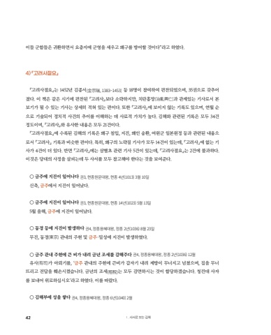 %uc774%ub4e4 %uad70%ud568%ub4e4%uc740 %uadc0%ud658%ud558%uba74%uc11c %uc694%ucda9%uc9c0%uc5d0 %uad70%uc601%uc744 %uc138%uc6b0%uace0 %uc65c%uad6c%ub97c %ubc29%uc5b4%ud560 %uac83%uc774%ub2e4%u201d%ub77c%uace0 %ud558%uc600%ub2e4.4) %u300e%uace0%ub824%uc0ac%uc808%uc694%u300f%u300e%uace0%ub824%uc0ac%uc808%uc694%u300f%ub294 1452%ub144 %uae40%uc885%uc11c(%u91d1%u5b97%u745e, 1383~1453) %ub4f1 18%uba85%uc774 %ucc38%uc5ec%ud558%uc5ec %ud3b8%ucc2c%ub418%uc5c8%uc73c%uba70, 35%uad8c%uc73c%ub85c %uac16%ucd94%uc5b4%uc84c%ub2e4. %uc774 %ucc45%uc740 %uac19%uc740 %uc2dc%uae30%uc5d0 %ud3b8%ucc2c%ub41c %u300e%uace0%ub824%uc0ac%u300f%ubcf4%ub2e4 %uc18c%ub7b5%ud558%uc9c0%ub9cc, %uce58%ub780%ud765%ub9dd(%u6cbb%u4e82%u8208%u4ea1)%uacfc %uad00%uacc4%uc788%ub294 %uae30%uc0ac%ub85c%uc11c %ubcf8%ubcf4%uae30%uac00 %ub420 %uc218 %uc788%ub294 %uae30%uc0ac%ub294 %uc0c1%uc138%ud788 %uc801%ud600 %uc788%ub294 %ud3b8%uc774%ub2e4. %ub610%ud55c %u300e%uace0%ub824%uc0ac%u300f%uc5d0 %ubcf4%uc774%uc9c0 %uc54a%ub294 %uae30%ub85d%ub3c4 %uc788%uc73c%uba70, %uc5f0%uc6d4 %uc21c%uc73c%ub85c %uae30%uc220%ub418%uc5b4 %uc815%uce58%uc801 %uc0ac%uac74%uc758 %ucd94%uc774%ub97c %uc774%ud574%ud558%ub294 %ub370 %uc0ac%ub8cc%uc801 %uac00%uce58%uac00 %ub192%ub2e4. %uae40%ud574%uc640 %uad00%ub828%ub41c %uae30%ub85d%uc740 %ubaa8%ub450 34%uac74 %uc815%ub3c4%uc774%uba70, %u300e%uace0%ub824%uc0ac%u300f%uc640 %uc720%uc0ac%ud55c %ub0b4%uc6a9%uc740 %ubaa8%ub450 21%uac74%uc774%ub2e4.%u300e%uace0%ub824%uc0ac%uc808%uc694%u300f%uc5d0 %uc218%ub85d%ub41c %uae40%ud574%uc758 %uae30%ub85d%uc740 %uc65c%uad6c %uce68%uc785, %uc9c0%uc9c4, %uc65c%uc778 %uc1a1%ud658, %uc5ec%uc6d0%uad70 %uc77c%ubcf8%uc6d0%uc815 %ub4f1%uacfc %uad00%ub828%ub41c %ub0b4%uc6a9%uc73c%ub85c%uc11c %u300e%uace0%ub824%uc0ac%u300f %uae30%ub85d%uacfc %ube44%uc2b7%ud55c %ud3b8%uc774%ub2e4. %ud2b9%ud788, %uc65c%uad6c%uc758 %ub178%ub7b5%uc9c8 %uae30%uc0ac%uac00 %ubaa8%ub450 14%uac74%uc774 %uc788%ub294%ub370, %u300e%uace0%ub824%uc0ac%u300f%uc5d0 %uc5c6%ub294 %uae30%uc0ac%uac00 4%uac74%uc774 %ub354 %uc788%ub2e4. %ubc18%uba74 %u300e%uace0%ub824%uc0ac%u300f%uc5d0%ub294 %uc0bc%ubcc4%ucd08 %uad00%ub828 %uae30%uc0ac 5%uac74%uc774 %uc788%ub294%ub370, %u300e%uace0%ub824%uc0ac%uc808%uc694%u300f%ub294 2%uac74%uc5d0 %ubd88%uacfc%ud558%ub2e4. %uc774%uac83%uc740 %ub2f9%ub300%uc758 %uc0ac%uc815%uc744 %uc0b4%ud53c%ub294%ub370 %ub450 %uc0ac%uc11c%ub97c %ubaa8%ub450 %ucc38%uace0%ud574%uc57c %ud55c%ub2e4%ub294 %uac83%uc744 %ubcf4%uc5ec%uc900%ub2e4.%u25cb %uae08%uc8fc%uc5d0 %uc9c0%uc9c4%uc774 %uc77c%uc5b4%ub098%ub2e4 %uad8c3, %ud604%uc885%uc6d0%ubb38%ub300%uc655, %ud604%uc885 4%ub144(1013) 3%uc6d4 10%uc77c%uc2e0%ucd95, %uae08%uc8fc%uc5d0%uc11c %uc9c0%uc9c4%uc774 %uc77c%uc5b4%ub0ac%ub2e4.%u25cb %uae08%uc8fc%uc5d0 %uc9c0%uc9c4%uc774 %uc77c%uc5b4%ub098%ub2e4 %uad8c3, %ud604%uc885%uc6d0%ubb38%ub300%uc655, %ud604%uc885 14%ub144(1023) 5%uc6d4 13%uc77c5%uc6d4 %uc744%ud574, %uae08%uc8fc%uc5d0 %uc9c0%uc9c4%uc774 %uc77c%uc5b4%ub0ac%ub2e4.%u25cb %ub3d9%uacbd %ub4f1%uc5d0 %uc9c0%uc9c4%uc774 %ubc1c%uc0dd%ud558%ub2e4 %uad8c4, %uc815%uc885%uc6a9%ud61c%ub300%uc655, %uc815%uc885 2%ub144(1036) 8%uc6d4 23%uc77c%ubb34%uc9c4, %ub3d9%uacbd(%u6771%u4eac) %uad00%ub0b4%uc758 %uc8fc%ud604 %ubc0f %uae08%uc8fc%u00b7%ubc00%uc131%uc5d0 %uc9c0%uc9c4%uc774 %ubc1c%uc0dd%ud558%uc600%ub2e4.%u25cb %uae08%uc8fc %uad00%ub0b4 %uc8fc%ud604%uc5d0 %ud070 %ube44%uac00 %ub0b4%ub824 %uae08%ub144 %uc870%uc138%ub97c %uac10%ud574%uc8fc%ub2e4 %uad8c4, %uc815%uc885%uc6a9%ud61c%ub300%uc655, %uc815%uc885 2%ub144(1036) 12%uc6d4%uc720%uc0ac(%u6709%u53f8)%uac00 %uc544%ub8b0%uae30%ub97c, %u2018%uae08%uc8fc %uad00%ub0b4%uc758 %uc8fc%ud604%uc5d0 %ud070%ube44%uac00 %uac11%uc790%uae30 %ub0b4%ub824 %uc81c%ubc29%uc774 %ubb34%ub108%uc9c0%uace0 %ub118%ucce4%uc73c%uba70, %uc9d1%uc744 %ubb34%ub108%ub728%ub9ac%uace0 %uc804%ub2f5%uc744 %ud6fc%uc190%uc2dc%ucf30%uc2b5%ub2c8%ub2e4. %uae08%ub144%uc758 %uc870%uc138(%u79df%u7a05)%ub294 %ubaa8%ub450 %uac10%uba74%ud558%uc2dc%ub294 %uac83%uc774 %ud569%ub2f9%ud558%uaca0%uc2b5%ub2c8%ub2e4. %uccad%ucee8%ub300 %uc0ac%uc790%ub97c %ubcf4%ub0b4%uc5b4 %uc704%ub85c%ud558%uc2ed%uc2dc%uc624%u2019%ub77c%uace0 %ud558%uc600%ub2e4. %uc774%ub97c %ub530%ub790%ub2e4.%u25cb %uae40%ud574%ubd80%uc5d0 %uc131%uc744 %uc313%ub2e4 %uad8c4, %uc815%uc885%uc6a9%ud61c%ub300%uc655, %uc815%uc885 6%ub144(1040) 2%uc6d442 %u2160. %uc0ac%uc11c%ub85c %ubcf4%ub294 %uae40%ud574