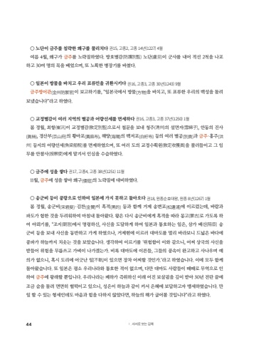 %u25cb %ub178%ub2e8%uc774 %uae08%uc8fc%ub97c %uce68%ub7b5%ud55c %uc65c%uad6c%ub97c %ubb3c%ub9ac%uce58%ub2e4 %uad8c15, %uace0%uc8852, %uace0%uc885 14%ub144(1227) 4%uc6d4%uc5ec%ub984 4%uc6d4, %uc65c%uad6c%uac00 %uae08%uc8fc%ub97c %ub178%ub7b5%uc9c8%ud558%uc600%ub2e4. %ubc29%ud638%ubcc4%uac10(%u9632%u8b77%u5225%u76e3) %ub178%ub2e8(%u76e7%u65e6)%uc774 %uad70%uc0ac%ub97c %ub0b4%uc5b4 %uc801%uc120 2%ucc99%uc744 %ub098%ud3ec%ud558%uace0 30%uc5ec %uba85%uc758 %ubaa9%uc744 %ubca0%uc5c8%uc73c%uba70, %ub610 %ub178%ud68d%ud55c %ubcd1%uc7a5%uae30%ub97c %ubc14%ucce4%ub2e4.%u25cb %uc77c%ubcf8%uc774 %ubc29%ubb3c%uc744 %ubc14%uce58%uace0 %uc6b0%ub9ac %ud45c%ub958%ubbfc%uc744 %uadc0%ud658%uc2dc%ud0a4%ub2e4 %uad8c16, %uace0%uc8853, %uace0%uc885 30%ub144(1243) 9%uc6d4%uae08%uc8fc%ubc29%uc5b4%uad00(%u91d1%u5dde%u9632%u79a6%u5b98)%uc774 %ubcf4%uace0%ud558%uae30%ub97c, %u201c%uc77c%ubcf8%uad6d%uc5d0%uc11c %ubc29%ubb3c(%u65b9%u7269)%uc744 %ubc14%uce58%uace0, %ub610 %ud45c%ub958%ud55c %uc6b0%ub9ac%uc758 %ubc31%uc131%uc744 %ub3cc%ub824%ubcf4%ub0c8%uc2b5%ub2c8%ub2e4%u201d%ub77c%uace0 %ud558%uc600%ub2e4.%u25cb %uad50%uc815%ubcc4%uac10%uc774 %uc5ec%ub7ec %uc9c0%uc5ed%uc758 %ubcc4%uacf5%uacfc %uc5b4%ub7c9%uc120%uc138%ub97c %uba74%uc138%ud558%ub2e4 %uad8c16, %uace0%uc8853, %uace0%uc885 37%ub144(1250) 1%uc6d4%ubd04 %uc815%uc6d4, %ucd5c%ud56d(%u5d14%u6c86)%uc774 %uad50%uc815%ubcc4%uac10(%u654e%u5b9a%u5225%u76e3)%uc73c%ub85c%uc11c %ucca9%ubb38%uc744 %ubcf4%ub0b4 %uccad%uc8fc(%u6df8%u5dde)%uc758 %uc124%uba74%uc790(%u96ea%u7dbf%u5b50), %uc548%ub3d9%uc758 %uc9c4%uc0ac(%u771e%u7d72), %uacbd%uc0b0%ubd80(%u4eac%u5c71%u5e9c)%uc758 %ud669%ub9c8%ud3ec(%u9ec3%u9ebb%u5e03), %ud574%uc591(%u6d77%u967d)%uc758 %ubc31%uc800%ud3ec(%u767d%u7d35%u5e03) %ub4f1%uc758 %uc5ec%ub7ec %ubcc4%uacf5(%u5225%u8ca2)%uacfc %uae08%uc8fc%u00b7%ud64d%uc8fc(%u6d2a%u5dde) %ub4f1%uc9c0%uc758 %uc5b4%ub7c9%uc120%uc138(%u9b5a%u6881%u8239%u7a05)%ub97c %uba74%uc81c%ud558%uc600%uc73c%uba70, %ub610 %uc5ec%ub7ec %ub3c4%uc758 %uad50%uc815%uc218%ud68d%uc6d0(%u654e%u5b9a%u6536%u7372%u54e1)%uc744 %ubd88%ub7ec%ub4e4%uc774%uace0 %uadf8 %uc784%ubb34%ub97c %uc548%ucc30%uc0ac(%u6309%u5bdf%u4f7f)%uc5d0%uac8c %ub9e1%uaca8%uc11c %uc778%uc2ec%uc744 %uc218%uc2b5%ud558%uc600%ub2e4.%u25cb %uae08%uc8fc%uc5d0 %uc131%uc744 %uc313%ub2e4 %uad8c17, %uace0%uc8854, %uace0%uc885 38%ub144(1251) 11%uc6d411%uc6d4, %uae08%uc8fc%uc5d0 %uc131%uc744 %uc313%uc544 %uc65c%uad6c(%u502d%u5bc7)%uc758 %ub178%ub7b5%uc9c8%uc5d0 %ub300%ube44%ud558%uc600%ub2e4.%u25cb %uc1a1%uad70%ube44 %ub4f1%uc774 %ud48d%ub791%uc73c%ub85c %uc778%ud558%uc5ec %uc77c%ubcf8%uc5d0 %uac00%uc9c0 %ubabb%ud558%uace0 %ub3cc%uc544%uc624%ub2e4 %uad8c18, %uc6d0%uc885%uc21c%ud6a8%ub300%uc655, %uc6d0%uc885 8%ub144(1267) 1%uc6d4%ubd04 %uc815%uc6d4, %uc1a1%uad70%ube44(%u5b8b%u541b%u6590)%u00b7%uae40%ucc2c(%u91d1%u8d0a)%uc774 %ud751%uc801(%u9ed1%u7684) %ub4f1%uacfc %ud568%uaed8 %uac70%uc81c %uc1a1%ubcc0%ud3ec(%u677e%u908a%u6d66)%uc5d0 %uc774%ub974%ub800%ub294%ub370, %ubc14%ub78c%uacfc %ud30c%ub3c4%uac00 %ud5d8%ud55c %uac83%uc744 %ub450%ub824%uc6cc%ud558%uc5ec %ub9c8%uce68%ub0b4 %ub3cc%uc544%uc654%ub2e4. %uc655%uc740 %ub2e4%uc2dc %uc1a1%uad70%ube44%uc5d0%uac8c %ud751%uc801%uc744 %ub530%ub77c %ubabd%uace0(%u8499%u53e4)%ub85c %uac00%ub3c4%ub85d %ud558%uc5ec %uc544%ub8b0%uae30%ub97c, %u201c%uc870%uc9c0(%u671d%u65e8)%uc5d0%uc11c %uba85%ub839%ud558%uc2e0, %uc0ac%uc2e0%uc744 %ub3c4%ub2ec%ud558%uac8c %ud558%uc5ec %uc77c%ubcf8%uacfc %ud1b5%ud638%ud558%ub294 %uc77c%uc740, %uc0bc%uac00 %ubc30%uc2e0(%u966a%u81e3) %uc1a1%uad70%ube44 %ub4f1%uc744 %ubcf4%ub0b4 %uc0ac%uc2e0%uc744 %ub3d9%ubc18%ud558%uace0 %uac00%uac8c %ud558%uc600%uc73c%ub098, %uac70%uc81c%ud604%uc5d0 %uc774%ub974%ub7ec %ub300%ub9c8%ub3c4%ub97c %uba40%ub9ac %ubc14%ub77c%ubcf4%ub2c8 %ub4dc%ub113%uc740 %ubc14%ub2e4%uc5d0 %ud48d%ud30c%uac00 %ud558%ub298%uae4c%uc9c0 %uce58%uc19f%ub294 %uac83%uc744 %ubcf4%uc558%uc2b5%ub2c8%ub2e4. %uc0dd%uac01%ud558%uc5ec %uc774%ub974%uae30%ub97c %u2018%uc704%ud5d8%ud568%uc774 %uc774%uc640 %uac19%uc73c%ub2c8, %uc5b4%ucc0c %uc0c1%uad6d%uc758 %uc0ac%uc2e0%uc744 %ubc1b%ub4e4%uc5b4 %uc704%ud5d8%uc744 %ubb34%ub985%uc4f0%uace0 %uac00%ubcbc%uc774 %ub098%uac00%uaca0%ub294%uac00. %ube44%ub85d %ub300%ub9c8%ub3c4%uc5d0 %uc774%ub978%ub4e4, %uadf8%ub4e4%uc758 %ud48d%uc18d%uc774 %uc644%uace0%ud558%uace0 %uc0ac%ub098%uc6b0%uba70 %uc608%uc758%uac00 %uc5c6%uc73c%ub2c8, %ud639%uc2dc %ub3c4%ub9ac%uc5d0 %uc5b4%uae0b%ub09c %uc77c[%u4e0d%u8ecc]%uc774 %uc788%uc73c%uba74 %uc7a5%ucc28 %uc5b4%ucc0c%ud560 %uac83%uc778%uac00.%u2019%ub77c%uace0 %ud558%uc600%uc2b5%ub2c8%ub2e4. %uc774%uc5d0 %ubaa8%ub450 %ud568%uaed8 %ub3cc%uc544%uc654%uc2b5%ub2c8%ub2e4. %ub610 %uc77c%ubcf8%uc740 %ud3c9%uc18c %uc6b0%ub9ac%ub098%ub77c%uc640 %ud1b5%ud638%ud55c %uc801%uc774 %uc5c6%uc73c%uba70, %ub2e4%ub9cc %ub300%ub9c8%ub3c4 %uc0ac%ub78c%ub4e4%uc774 %ub54c%ub54c%ub85c %ubb34%uc5ed%uc73c%ub85c %uc778%ud558%uc5ec %uae08%uc8fc%uc5d0 %uc655%ub798%ud560 %ubfd0%uc785%ub2c8%ub2e4. %uc6b0%ub9ac%ub098%ub77c%ub294 %ud3d0%ud558%uac00 %uc989%uc704%ud558%uc2e0 %uc774%ub798 %uc5b4%uc9c4 %ubcf4%uc0b4%ud54c%uc744 %uae4a%uc774 %ubc1b%uc544 30%ub144 %uc804%ub780 %ub05d%uc5d0 %uc870%uae08 %uc228%uc744 %ub3cc%ub824 %uba74%uba74%ud788 %ud5d0%ub5a1%uc774%uace0 %uc788%uc73c%ub2c8, %uc131%uc740%uc774 %ud558%ub298%uacfc %uac19%uc774 %ucee4%uc11c %uc740%ud61c%uc5d0 %ubcf4%ub2f5%ud558%uace0%uc790 %ub9f9%uc138%ud558%uc600%uc2b5%ub2c8%ub2e4. %ub9cc%uc77c %ud560 %uc218 %uc788%ub294 %ud615%uc138%uc778%ub370%ub3c4 %ub9c8%uc74c%uacfc %ud798%uc744 %ub2e4%ud558%uc9c0 %uc54a%uc558%ub2e4%uba74, %ud558%ub298%uc758 %ud574%uac00 %uad7d%uc5b4%ubcfc %uac83%uc785%ub2c8%ub2e4%u201d%ub77c%uace0 %ud558%uc600%ub2e4.44 %u2160. %uc0ac%uc11c%ub85c %ubcf4%ub294 %uae40%ud574