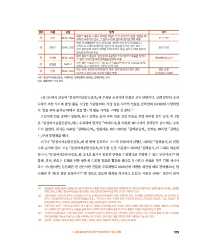 %ubc88%ud638 %uc774%ub984 %uc0dd%ubab0 %ud589%uc801 %ube44%uace0%u246d %uc1a1%ube48 1542~1592 %uc219%ud615%uc758 %uc99d%uc190%uc790, %ub098%uba74%uc11c %ud2b9%uc774%ud55c %uae30%uc9c8%uc774 %uc788%uace0 %uac15%uac74%ud558%uace0 %uad73%uc148. %uc784%uc9c4%ub780 %ub54c %uc65c%uc801%uacfc %uc2f8%uc6b0%ub2e4%uac00 %uc804%uc0ac, %uadf8 %uc77c%uc774 %ub098%ub77c%uc5d0 %uc54c%ub824%uc838 %uacf5%uc870%ucc38%uc758%uc5d0 %ucd94%uc99d %ubcf8%uad00 %uccad%uc8fc%u246e %uae40%ub4dd%uae30 1549~1592%uc815%ub791 %uc5b5%uc800(%u5104%u7820)%uc758 %uc190%uc790, %ub0a8%ucabd%uc73c%ub85c %ub0b4%ub824%uc640 %ubd80%uc758 %uc7a5%uc218%uac00 %ub418%uc5c8%uc73c%ub098 %uc0ac%uc9c1%ud558%uace0 %uace0%ud5a5%uc73c%ub85c %ub3cc%uc544%uc634. %uc784%uc9c4%ub780 %ub54c %ub3d9%ubb38%uc744 %uc9c0%ud0a4%ub294 %uc7a5%uc774 %ub418%uc5b4 %u2026 %uc131%uc774 %ud568%ub77d%ub428%uc5d0 %uc774%ub974%ub7ec %uc804%ub825%uc744 %ub2e4%ud574 %uc2f8%uc6b0%ub2e4 %uc8fd%uc74c. %uc77c%uc774 %ub098%ub77c%uc5d0 %uc54c%ub824%uc838 %ucca8%uc9c0%uc911%ucd94%ubd80%uc0ac%uc5d0 %ucd94%uc99d%ubcf8%uad00 %uc758%uc131%u246f %uc774%ub300%ud615 1543~1592 %ucc38%uc9c0 %uc911%ud604%uc758 %uc99d%uc190%uc790. %uc784%uc9c4%ub780 %ub54c %uc218%ubb38%uc7a5%uc774 %ub418%uc5b4 %uc808%uc758%uc758 %uc8fd%uc74c%uc744 %ub9de%uc558%ub2e4. %uadf8 %uc77c%uc774 %ub098%ub77c%uc5d0 %uc54c%ub824%uc838 %uc7a5%uc608%uc6d0%ud310%uacb0%uc0ac%uc5d0 %ucd94%uc99d %u674e%u5927%u69ae%uc73c%ub85c %uc624%uae30%u2470 %uae40%uc77c%uc900 1482~? %uc790%ub294 %ud589%uc6d0 %uc218%ub85c%uc758 %ud6c4%uc190, %uac00%uc815 %uac11%uc790%ub144(1564)111%uc5d0 %ubb38%uacfc 3%ub4f1%uc73c%ub85c %uae09%uc81c, %uacbd%uc0c1%ub3c4 %ub3c4%uc0ac, %ub2f4%uc591%ubd80%uc0ac, %uc0ac%ud5cc%ubd80 %uc7a5%ub839 %uc9c0%ub0c4%u2471 %uc548%ud76c 1551~1613 %uc790%ub294 %uc5b8%uc6b0, %ubb38%uc131%uacf5 %uc548%uc720(%uc548%ud5a5)%uc758 %ud6c4%uc190, %ub9cc%ub825 %uc744%uc720%ub144(1585) %uae09%uc81c, %ub300%uad6c%ubd80%uc0ac, %ubb38%uc7a5%uc73c%ub85c %uc138%uc0c1%uc5d0 %uc774%ub984%uc744 %ub5a8%uce68%ubcf8%uad00 %uc21c%ud765. %u300e%uae40%ud574%uc74d%uc9c0%u300f(1895)%uc790%ub8cc: %u300e%ubd84%uc131%uc5ec%uc9c0%uc2b9%ub78c%uc2e0%uc99d%ucd08%u300f. %uc774%ubcd1%ud0dc %ud3b8, %u300e%uae40%ud574%uc778%ubb3c%uc9c0-%ubcf4%uc720%ud3b8%u300f, %uae40%ud574%ubb38%ud654%uc6d0, 2001.%ube44%uace0: %uc0dd%ubab0%uc5f0%ub300%ub294 %uc870%uc0ac%u00b7%ucd94%uac00.<%ud45c 13>%uc5d0%uc11c %ubcf4%ub4ef%uc774 %u300e%ubd84%uc131%uc5ec%uc9c0%uc2b9%ub78c%uc2e0%uc99d%ucd08%u300f%uc5d0 %uc218%ub85d%ub41c %uc870%uc120%uc2dc%ub300 %uc778%ubb3c%uc740 %ubaa8%ub450 18%uba85%uc774%ub2e4. %uace0%ub824 %ub9d0%ubd80%ud130 %uc870%uc120 17%uc138%uae30 %ucd08%ubc18 %uc0ac%uc774%uc5d0 %ucd9c%uc0dd%u00b7%ud65c%ub3d9%u00b7%uc0ac%ub9dd%ud55c %uc0ac%ub78c%ub4e4%uc774%ub2e4. %uac00%uc7a5 %ub2a6%uc740 %uc2dc%uae30%uc758 %uc778%ubb3c%uc740 %uc548%ud76c%uc778%ub370 1613%ub144%uc5d0 %uc0ac%ub9dd%ud558%uc600%ub2e4. %uc778%ubb3c %uc218%ub85d %uc21c%uc11c%ub294 %ub300%uccb4%ub85c %uc0dd%ubab0 %uc5f0%ub3c4%uc640 %ud65c%ub3d9 %uc2dc%uae30%ub97c %uace0%ub824%ud55c %uac83 %uac19%ub2e4.112%uc870%uc120%uc2dc%ub300 %uc778%ubb3c %uc911%uc5d0%uc11c %uc591%ubd09%ub798, %ub958%uc2dd, %uc548%ud76c%ub294 %uc74d%uc9c0 %uc218%ub85d %uc778%ubb3c %uc120%uc815 %ud750%ub984%uc744 %ubcf4%uba74 %ud2b9%uc774%ud55c %uc810%uc774 %uc788%ub2e4. %uc774 3%uba85%uc740 %u300e%ubd84%uc131%uc5ec%uc9c0%uc2b9%ub78c%uc2e0%uc99d%ucd08%u300f%uc5d0%ub294 %uc218%ub85d%ub418%uc5b4 %uc788%uc9c0%ub9cc %u300e%uc5ec%uc9c0%ub3c4%uc11c%u300f%ub97c %ube44%ub86f%ud55c 18~19%uc138%uae30 %uc911%ud6c4%ubc18%uc758 %uc74d%uc9c0%uc5d0%ub294 %uc218%ub85d%ub418%uc9c0 %uc54a%uc558%ub2e4. %ub958%uc2dd%uc740 1841%ub144 %u300e%uae40%ud574%ubd80%uc74d%uc9c0%u300f, %uc591%ubd09%ub798%ub294 1881~1883%ub144 %u300e%uae40%ud574%ubd80%uc74d%uc9c0%u300f, %uc548%ud76c%ub294 1895%ub144 %u300e%uae40%ud574%uc74d%uc9c0%u300f%ubd80%ud130 %ub4f1%uc7a5%ud558%uace0 %uc788%ub2e4.%ub354%uad6c%ub098 %u300e%ubd84%uc131%uc5ec%uc9c0%uc2b9%ub78c%uc2e0%uc99d%ucd08%u300f%uc758 %uccab %ubc88%uc9f8 %uae40%uc870%ubd80%ud130 %ub9c8%uc9c0%ub9c9 %uc548%ud76c%uae4c%uc9c0 18%uba85%uc740 1895%ub144 %u300e%uae40%ud574%uc74d%uc9c0%u300f%uc758 %uc778%ubb3c %uc218%ub85d %uc21c%uc11c%uc640 %uac19%ub2e4. %uc774%ub294 %u300e%ubd84%uc131%uc5ec%uc9c0%uc2b9%ub78c%uc2e0%uc99d%ucd08%u300f%uc758 %uc778%ubb3c %uc120%uc815 %uae30%uc900%uc744113 1895%ub144 %u300e%uae40%ud574%uc74d%uc9c0%u300f%uac00 %uadf8%ub300%ub85c %uacc4%uc2b9%ud558%uc600%uac70%ub098, %u300e%ubd84%uc131%uc5ec%uc9c0%uc2b9%ub78c%uc2e0%uc99d%ucd08%u300f%ub97c %uadf8%ub300%ub85c %uc62e%uaca8%uc11c %ub3d9%uc77c%ud55c %uc778%ubb3c%uc744 %uc218%ub85d%ud588%ub2e4%uace0 %ucd94%uc815%ud560 %uc218 %uc788%ub294 %ubd80%ubd84%uc774%ub2e4.114 %uc591%ubd09%ub798, %ub958%uc2dd, %uc548%ud76c%ub294 %uae40%ud574%uc758 %uc778%ubb3c %ud56d%ubaa9%uc5d0 %uc218%ub85d%ub420 %uc815%ub3c4%uc758 %ud65c%ub3d9%uc744 %ud588%ub2e4%uace0 %ud3c9%uac00%ub41c%ub2e4. %uc548%ud76c%uc758 %uacbd%uc6b0 %uae40%ud574 %uc7ac%uc9c0%uc0ac%uc871%uc774 %uc544%ub2c8%uc5c8%uc9c0%ub9cc, %uc784%uc9c4%uc65c%ub780 %uc804 %uc2e0%uc0b0%uc11c%uc6d0 %uac74%ub9bd%uc744 %uc8fc%ub3c4%ud558%uc600%uace0 1608%ub144%uc5d0 %uc11c%uc6d0%uc744 %uc7ac%uac74%ud560 %ub54c%ub3c4 %uad00%uc5ec%ud588%uc73c%uba70, %uc784%uc9c4%uc65c%ub780 %ud6c4 %uc81c1%ud638 %ud5a5%uc548 %uc785%ub85d%uc790%uac00115 %ub420 %uc815%ub3c4%ub85c %uc911%uc694%ud55c %uc704%uce58%ub97c %ucc28%uc9c0%ud558%uace0 %uc788%uc5c8%ub2e4. %uc774%ub4e4%uc740 19%uc138%uae30 %uc911%ubc18%uc774 %ub418%uc5b4111%u3000 %uae40%uc77c%uc900%uc740 %u300e%uae40%ud574%uc778%ubb3c%uc9c0-%ubcf4%uc720%ud3b8%u300f%uc5d0 1482%ub144%uc5d0 %ud0dc%uc5b4%ub098 %uc911%uc885 29%ub144(1534)%uc5d0 %ubb38%uacfc %uae09%uc81c%ud558%uc600%ub2e4%uace0 %ud588%uc73c%ub098(%uc774%ubcd1%ud0dc %ud3b8, %u300e%uae40%ud574%uc778%ubb3c%uc9c0-%ubcf4%uc720%ud3b8%u300f, %uae40%ud574%ubb38%ud654%uc6d0, 2001, 33%ucabd), %u300e%ubd84%uc131%uc5ec%uc9c0%uc2b9%ub78c%uc2e0%uc99d%ucd08%u300f%uc5d0%ub294 %uac00%uc815 %uac11%uc790%ub144(1564)%uc5d0 %uae09%uc81c%ud55c %u