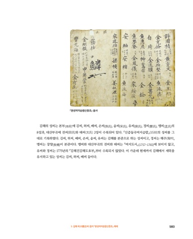 %u300e%ubd84%uc131%uc5ec%uc9c0%uc2b9%ub78c%uc2e0%uc99d%ucd08%u300f %uc74c%uc0ac%uae40%ud574%uc758 %uc131%uc528%ub294 %ubcf8%ubd80(%u672c%u5e9c)%uc5d0 %uae40%uc528, %ud5c8%uc528, %ubc30%uc528, %uc190%uc528(%u5b6b%u6c0f), %uc1a1%uc528(%u5b8b%u6c0f), %uc720%uc528(%u5ebe%u6c0f), %uc815%uc528(%u912d%u6c0f), %ub9f9%uc528(%u5b5f%u6c0f)%uc758 8%uc131%uacfc, %ub300%uc0b0%ubd80%uace1%uc5d0 %uc804%uc528(%u7530%u6c0f)%uc640 %ud0dc%uc528(%u592a%u6c0f) 2%uc131%uc774 %uc218%ub85d%ub418%uc5b4 %uc788%ub2e4. %u300e%uc2e0%uc99d%ub3d9%uad6d%uc5ec%uc9c0%uc2b9%ub78c%u300f(1530)%uc758 %uc131%uc528%ub97c %uadf8%ub300%ub85c %uae30%ub85d%ud558%uc600%ub2e4. %uae40%uc528, %ud5c8%uc528, %ubc30%uc528, %uc190%uc528, %uc1a1%uc528, %uc720%uc528%ub294 %uae40%ud574%ub97c %ubcf8%uad00%uc73c%ub85c %ud558%ub294 %uc131%uc528%uc774%uace0, %uc815%uc528%ub294 %ud574%uc8fc(%u6d77%u5dde), %ub9f9%uc528%ub294 %uc7a5%uc591(%u9577%u694a)%uc774 %ubcf8%uad00%uc774%ub2e4. %ub9f9%uc528%uc640 %ub300%uc0b0%ubd80%uace1%uc758 %uc804%uc528%uc640 %ud0dc%uc528%ub294 %u300e%uc5ec%uc9c0%ub3c4%uc11c%u300f(1757~1765)%uc5d0 %ubcf4%uc774%uc9c0 %uc54a%uace0, %uc720%uc528%uc640 %uc815%uc528%ub294 1775%ub144%uc758 %u300e%uae40%ud574%uc9c4%uae40%ud574%ub3c4%ud638%ubd80%u300f%ubd80%ud130 %uc218%ub85d%ub418%uc9c0 %uc54a%uc558%ub2e4. %uc774 %uac00%uc6b4%ub370 %ud604%uc7ac%uae4c%uc9c0 %uae40%ud574%uc5d0%uc11c %uc138%ub825%uc744 %uc720%uc9c0%ud558%uace0 %uc788%ub294 %uc131%uc528%ub294 %uae40%uc528, %ud5c8%uc528, %ubc30%uc528 %ub4f1%uc774%ub2e4.3. %uae40%ud574 %ucd5c%uace0(%u6700%u53e4)%uc758 %uc74d%uc9c0 %u300e%ubd84%uc131%uc5ec%uc9c0%uc2b9%ub78c%uc2e0%uc99d%ucd08%u300f %ud574%uc81c 583