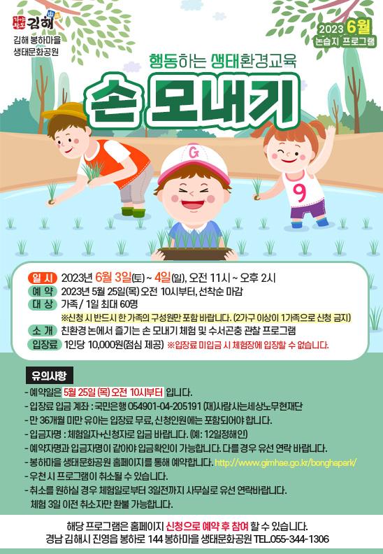 • 행동하는 생태환경교육: 손 모내기 2023-06-03 (토) 오전 11시 ~ 오후 2시 입장료 : 10,000원