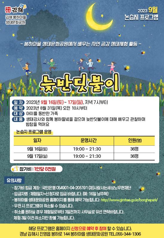 • 늦반딧불이 (추가개설) 2023-09-17 (일) 저녁 7시~9시30분 정원 : 36명 입장료 : 8,000원