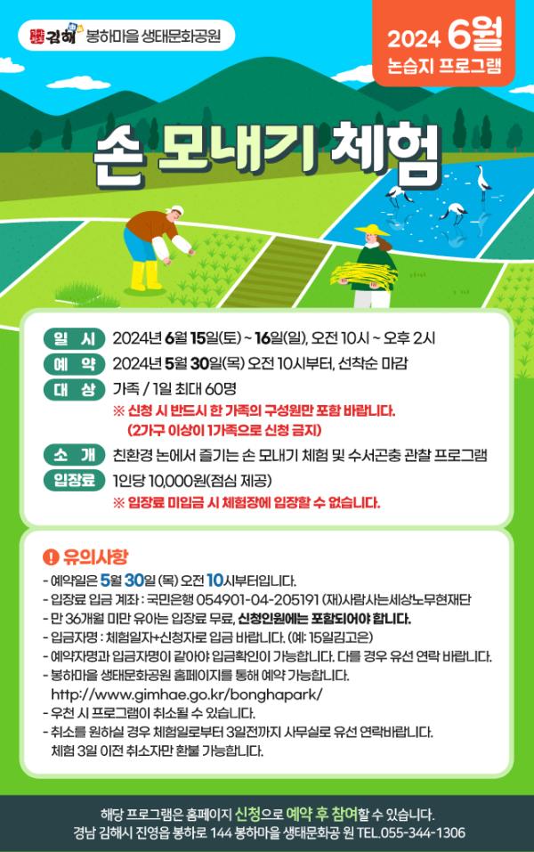• 손모내기 체험 2024-06-16 (일) 오전10시 - 오후2시 정원 : 60명 입장료 : 10,000원