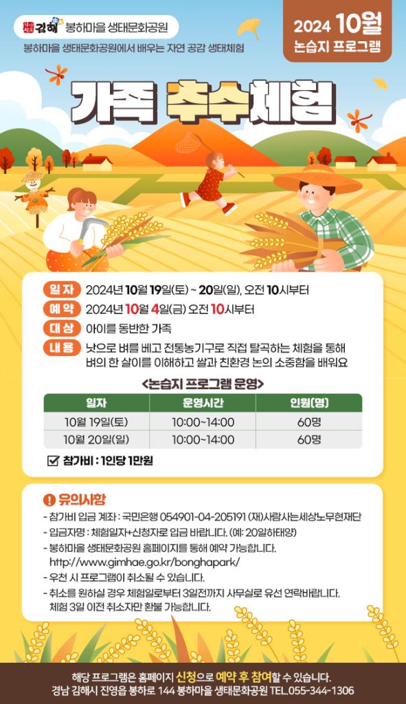 • 가족 추수체험 2024-10-20 (일) 정원 : 60명 입장료 : 10,000원