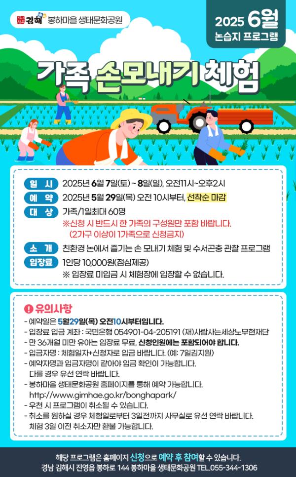 • 가족 손모내기 체험 2025-06-08 (일) 오전11시~오후2시 정원 : 60명 입장료 : 10,000원