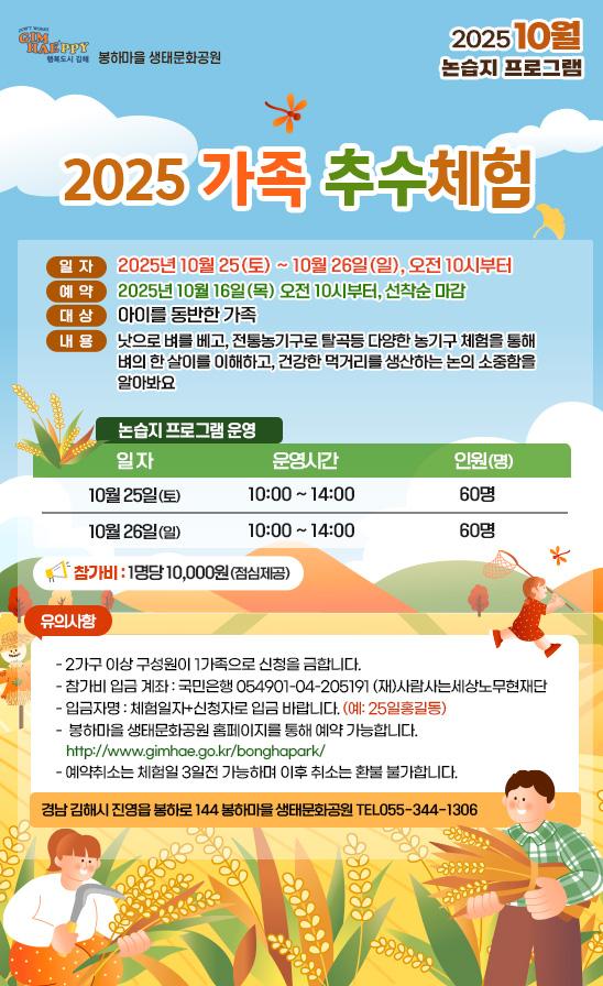 • 가족 추수체험 2025-10-26 (일) 오전 10시 ~ 오후 2시 정원 : 60명 입장료 : 10,000원