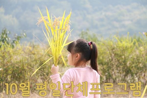 • [유아 단체 체험] 우리는 꼬마 농부! 추수 체험 예약접수 : 2019-09-19 목요일 10 시 ~ 2019-09-19 목요일 11시 10월 평일 시간 : 10:30 ~ 12:00 대상 : 어린이집, 유치원, 초등학교 단체(유아 및 어린이) 정원 : 각 45명 입장료 : 무료