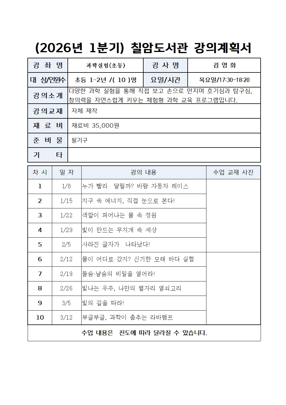 -. 강의 계획서를 다운받아 주세요. 수업 일정은 강의 계획서에 따라 진행되며 변동사항이 있을 시에만 따로 문자 등으로 연락을 드립니다.