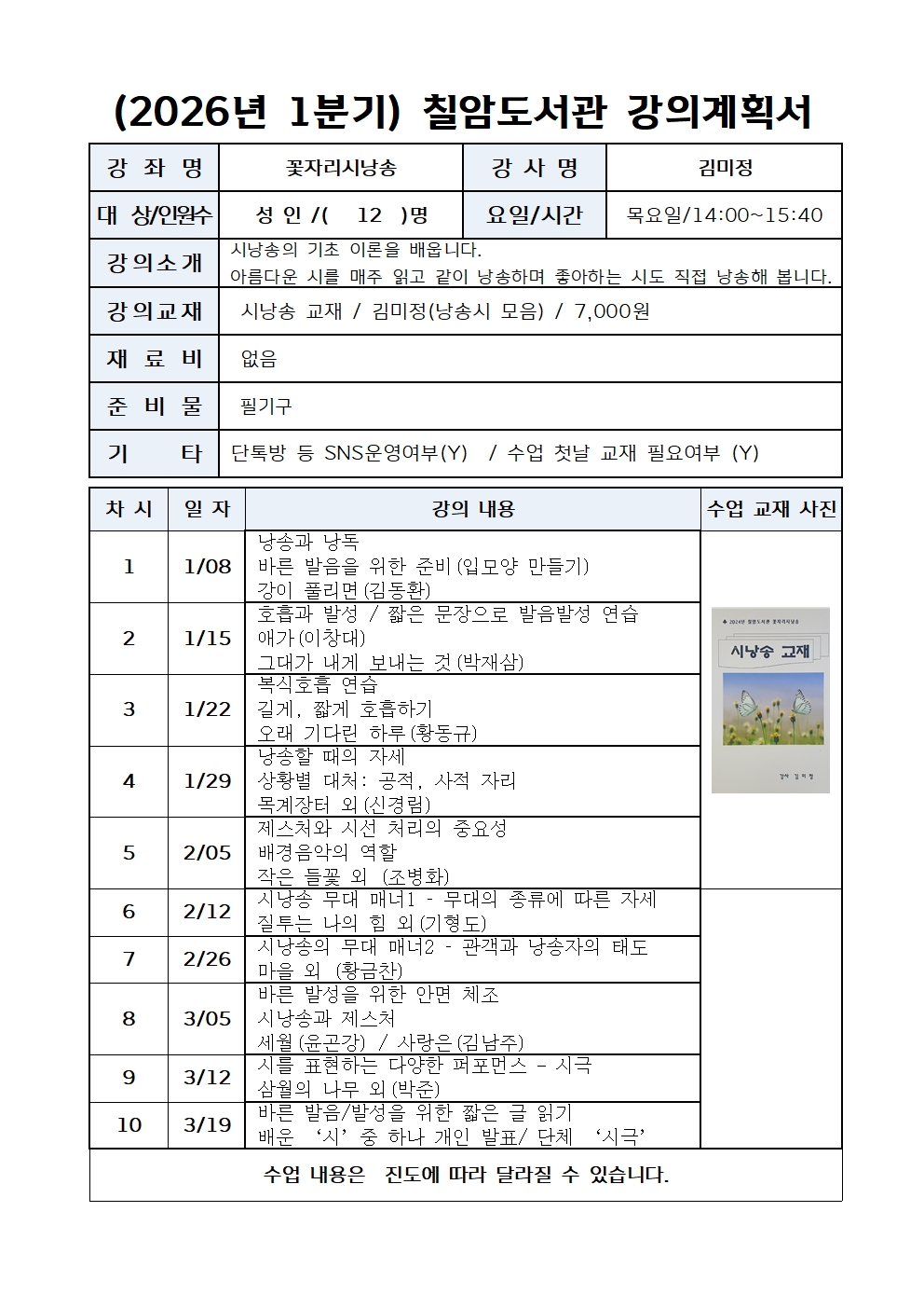 -.강의 계획서를 다운받아 주세요. 수업 일정은 강의 계획서에 따라 진행되며 변동사항이 있을 시에만 따로 문자 등으로 연락을 드립니다.