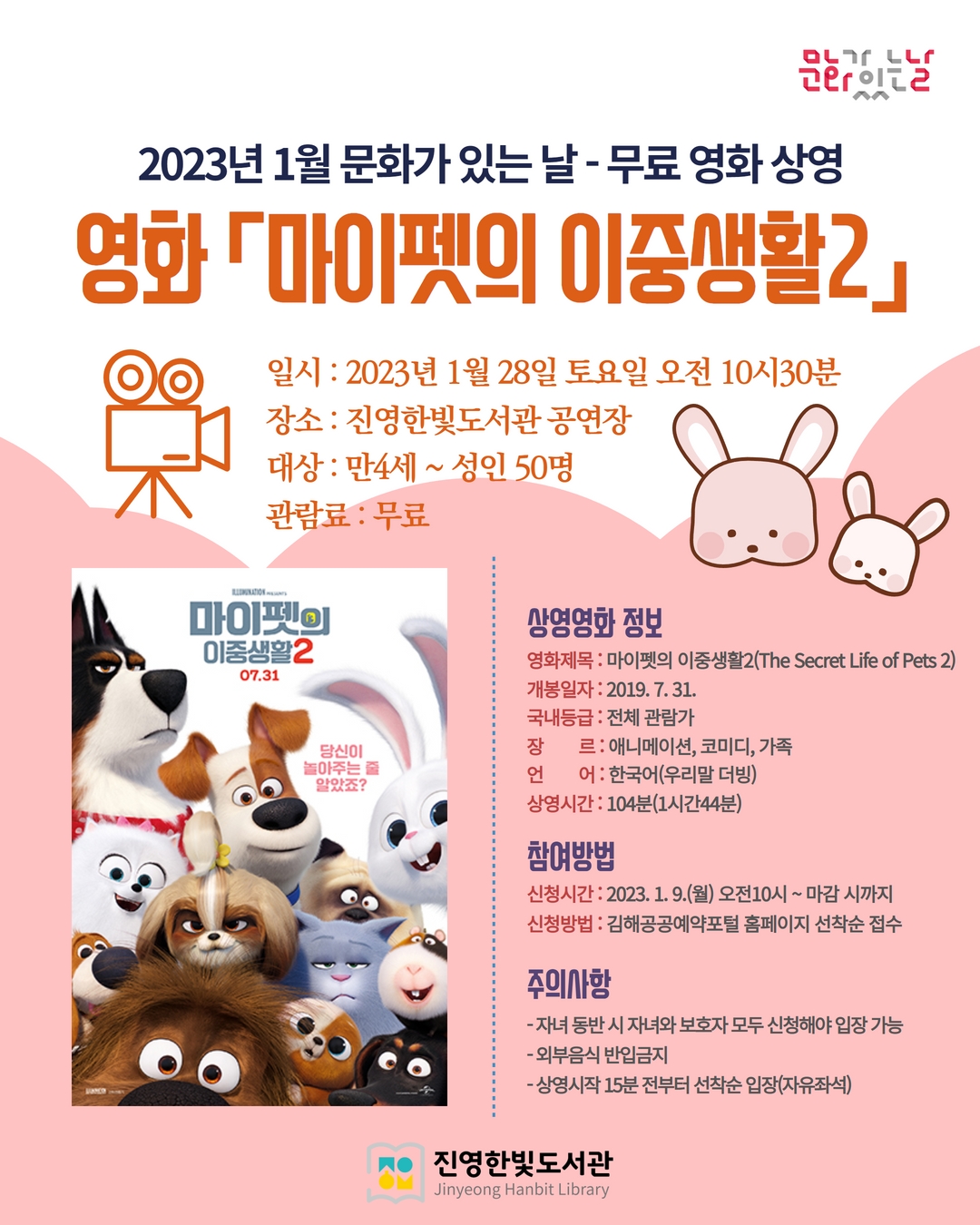진영한빛도서관 [1월 문화가 있는 날] 무료 영화 상영 - 영화 마이펫의 이중생활2