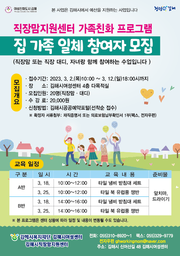 여성센터 직장맘 가족친화 프로그램 집 가족 일체 참여자 모집 B반