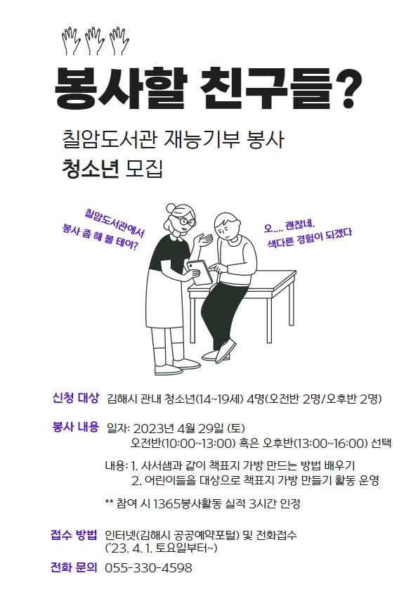칠암도서관 (오후반)칠암도서관 재능기부 봉사 청소년 모집
