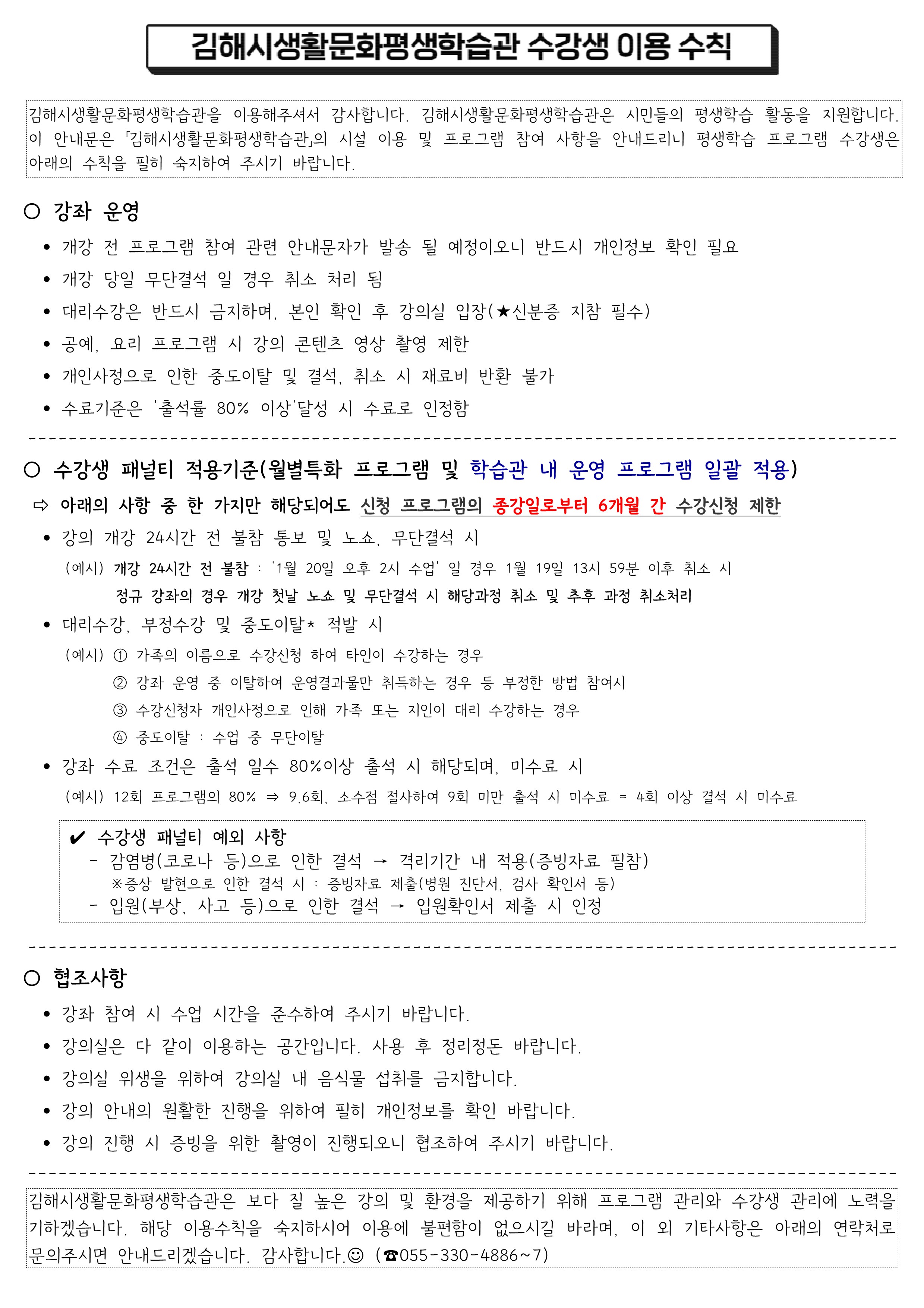 ★프로그램 신청 시 수강생 이용수칙을 반드시 확인 바랍니다.(※패널티 적용기준 확인 필수!) ▶이용수칙 미숙지로 발생하는 불이익은 기관에서 책임지지 않습니다