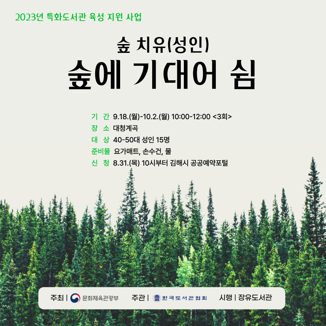 「2023년 특화도서관 육성 지원 사업」에 선정되어 다양한 치유 특화 프로그램을 운영합니다.