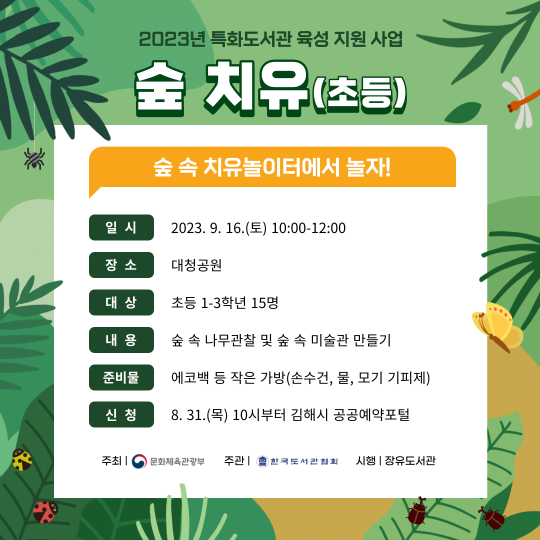 「2023년 특화도서관 육성 지원 사업」에 선정되어 다양한 치유 특화 프로그램을 운영합니다.