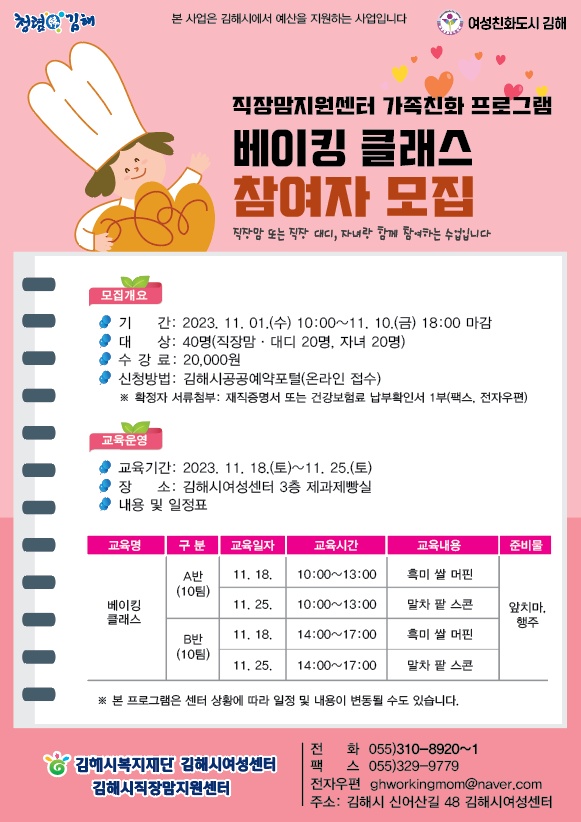 여성센터 직장맘 가족친화 베이킹 클래스 참여자 모집(A반)